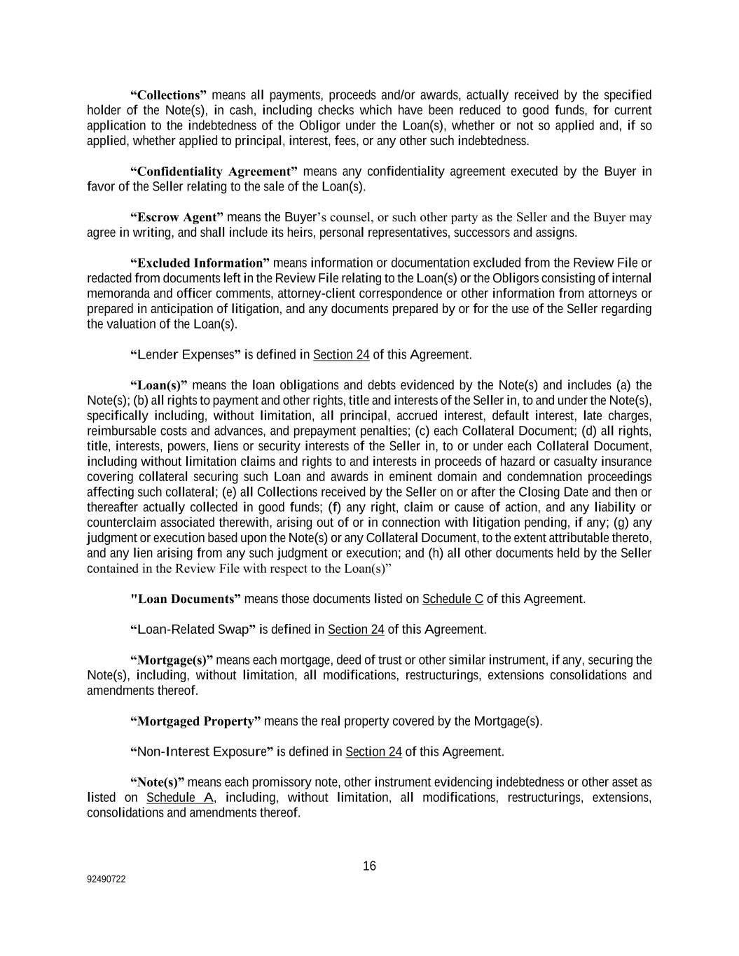16 92490722 “Collections” means all payments, proceeds and/or awards, actually received by the specified holder of the Note(s), in cash, including checks which have been reduced to good funds, for current application to the indebtedness of the Obligor under the Loan(s), whether or not so applied and, if so applied, whether applied to principal, interest, fees, or any other such indebtedness. “Confidentiality Agreement” means any confidentiality agreement executed by the Buyer in favor of the Seller relating to the sale of the Loan(s). “Escrow Agent” means the Buyer’s counsel, or such other party as the Seller and the Buyer may agree in writing, and shall include its heirs, personal representatives, successors and assigns. “Excluded Information” means information or documentation excluded from the Review File or redacted from documents left in the Review File relating to the Loan(s) or the Obligors consisting of internal memoranda and officer comments, attorney-client correspondence or other information from attorneys or prepared in anticipation of litigation, and any documents prepared by or for the use of the Seller regarding the valuation of the Loan(s). “Lender Expenses” is defined in Section 24 of this Agreement. “Loan(s)” means the loan obligations and debts evidenced by the Note(s) and includes (a) the Note(s); (b) all rights to payment and other rights, title and interests of the Seller in, to and under the Note(s), specifically including, without limitation, all principal, accrued interest, default interest, late charges, reimbursable costs and advances, and prepayment penalties; (c) each Collateral Document; (d) all rights, title, interests, powers, liens or security interests of the Seller in, to or under each Collateral Document, including without limitation claims and rights to and interests in proceeds of hazard or casualty insurance covering collateral securing such Loan and awards in eminent domain and condemnation proceedings affecting such collateral; (e) all Collections received by the Seller on or after the Closing Date and then or thereafter actually collected in good funds; (f) any right, claim or cause of action, and any liability or counterclaim associated therewith, arising out of or in connection with litigation pending, if any; (g) any judgment or execution based upon the Note(s) or any Collateral Document, to the extent attributable thereto, and any lien arising from any such judgment or execution; and (h) all other documents held by the Seller contained in the Review File with respect to the Loan(s)” "Loan Documents” means those documents listed on Schedule C of this Agreement. “Loan-Related Swap” is defined in Section 24 of this Agreement. “Mortgage(s)” means each mortgage, deed of trust or other similar instrument, if any, securing the Note(s), including, without limitation, all modifications, restructurings, extensions consolidations and amendments thereof. “Mortgaged Property” means the real property covered by the Mortgage(s). “Non-Interest Exposure” is defined in Section 24 of this Agreement. “Note(s)” means each promissory note, other instrument evidencing indebtedness or other asset as listed on Schedule A, including, without limitation, all modifications, restructurings, extensions, consolidations and amendments thereof.