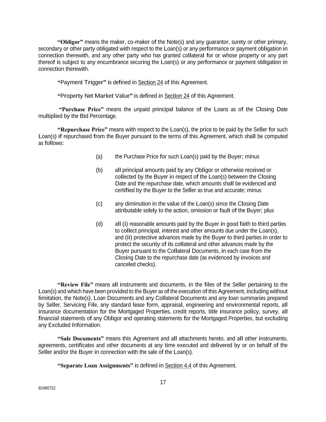 17 92490722 “Obligor” means the maker, co-maker of the Note(s) and any guarantor, surety or other primary, secondary or other party obligated with respect to the Loan(s) or any performance or payment obligation in connection therewith, and any other party who has granted collateral for or whose property or any part thereof is subject to any encumbrance securing the Loan(s) or any performance or payment obligation in connection therewith. “Payment Trigger” is defined in Section 24 of this Agreement. “Property Net Market Value” is defined in Section 24 of this Agreement. “Purchase Price” means the unpaid principal balance of the Loans as of the Closing Date multiplied by the Bid Percentage. “Repurchase Price” means with respect to the Loan(s), the price to be paid by the Seller for such Loan(s) if repurchased from the Buyer pursuant to the terms of this Agreement, which shall be computed as follows: (a) the Purchase Price for such Loan(s) paid by the Buyer; minus (b) all principal amounts paid by any Obligor or otherwise received or collected by the Buyer in respect of the Loan(s) between the Closing Date and the repurchase date, which amounts shall be evidenced and certified by the Buyer to the Seller as true and accurate; minus (c) any diminution in the value of the Loan(s) since the Closing Date attributable solely to the action, omission or fault of the Buyer; plus (d) all (i) reasonable amounts paid by the Buyer in good faith to third parties to collect principal, interest and other amounts due under the Loan(s), and (ii) protective advances made by the Buyer to third parties in order to protect the security of its collateral and other advances made by the Buyer pursuant to the Collateral Documents, in each case from the Closing Date to the repurchase date (as evidenced by invoices and canceled checks). “Review File” means all instruments and documents, in the files of the Seller pertaining to the Loan(s) and which have been provided to the Buyer as of the execution of this Agreement, including without limitation, the Note(s), Loan Documents and any Collateral Documents and any loan summaries prepared by Seller, Servicing File, any standard lease form, appraisal, engineering and environmental reports, all insurance documentation for the Mortgaged Properties, credit reports, title insurance policy, survey, all financial statements of any Obligor and operating statements for the Mortgaged Properties, but excluding any Excluded Information. “Sale Documents” means this Agreement and all attachments hereto, and all other instruments, agreements, certificates and other documents at any time executed and delivered by or on behalf of the Seller and/or the Buyer in connection with the sale of the Loan(s). “Separate Loan Assignments” is defined in Section 4.4 of this Agreement.