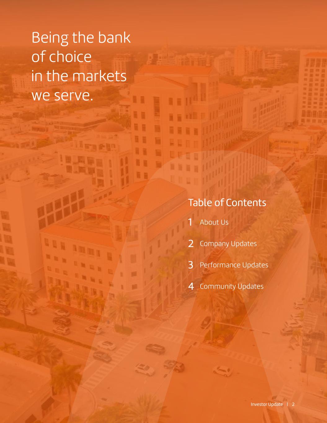 Being the bank of choice in the markets we serve. Table of Contents 1 2 3 4 About Us Company Updates Performance Updates Community Updates Investor Update | 2