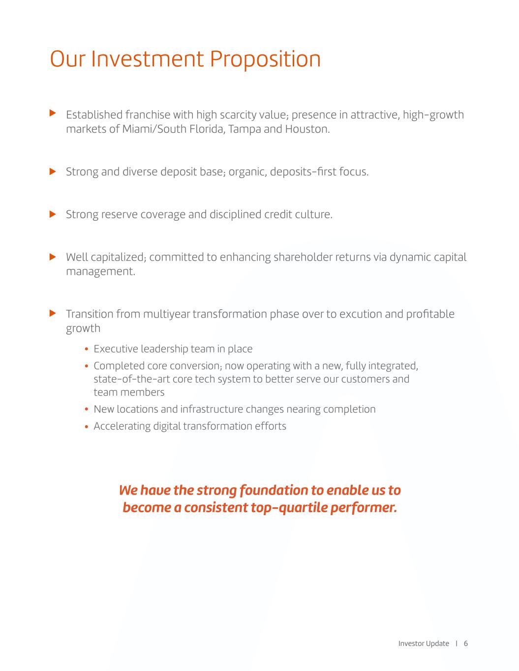 Our Investment Proposition Established franchise with high scarcity value; presence in attractive, high-growth markets of Miami/South Florida, Tampa and Houston. Strong and diverse deposit base; organic, deposits-first focus. Strong reserve coverage and disciplined credit culture. Well capitalized; committed to enhancing shareholder returns via dynamic capital management. Transition from multiyear transformation phase over to excution and profitable growth Investor Update | 6 Executive leadership team in place Completed core conversion; now operating with a new, fully integrated, state-of-the-art core tech system to better serve our customers and team members New locations and infrastructure changes nearing completion Accelerating digital transformation efforts We have the strong foundation to enable us to become a consistent top-quartile performer.