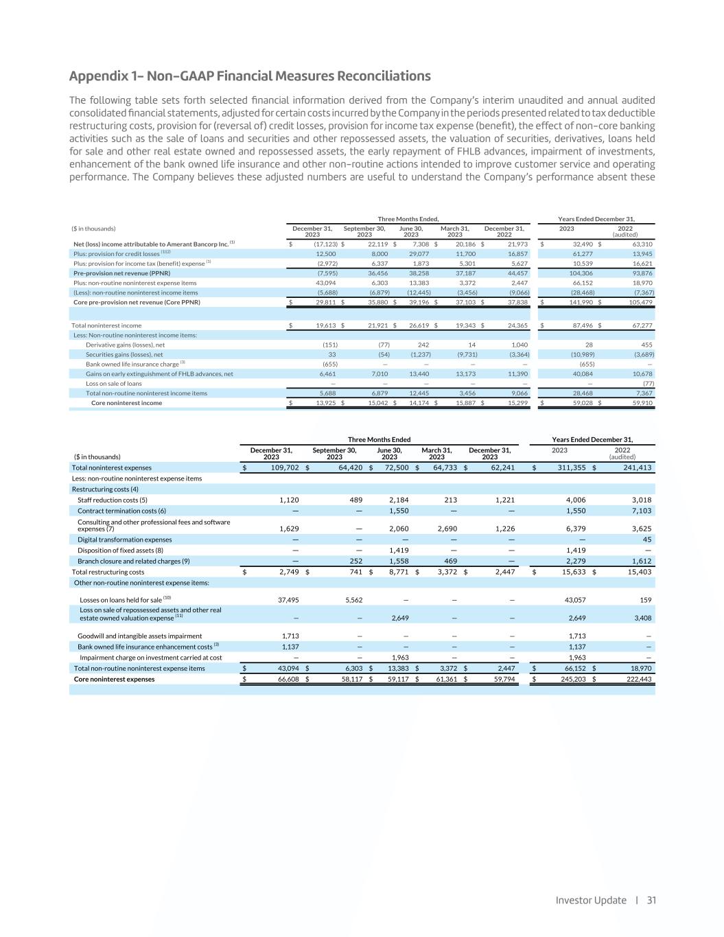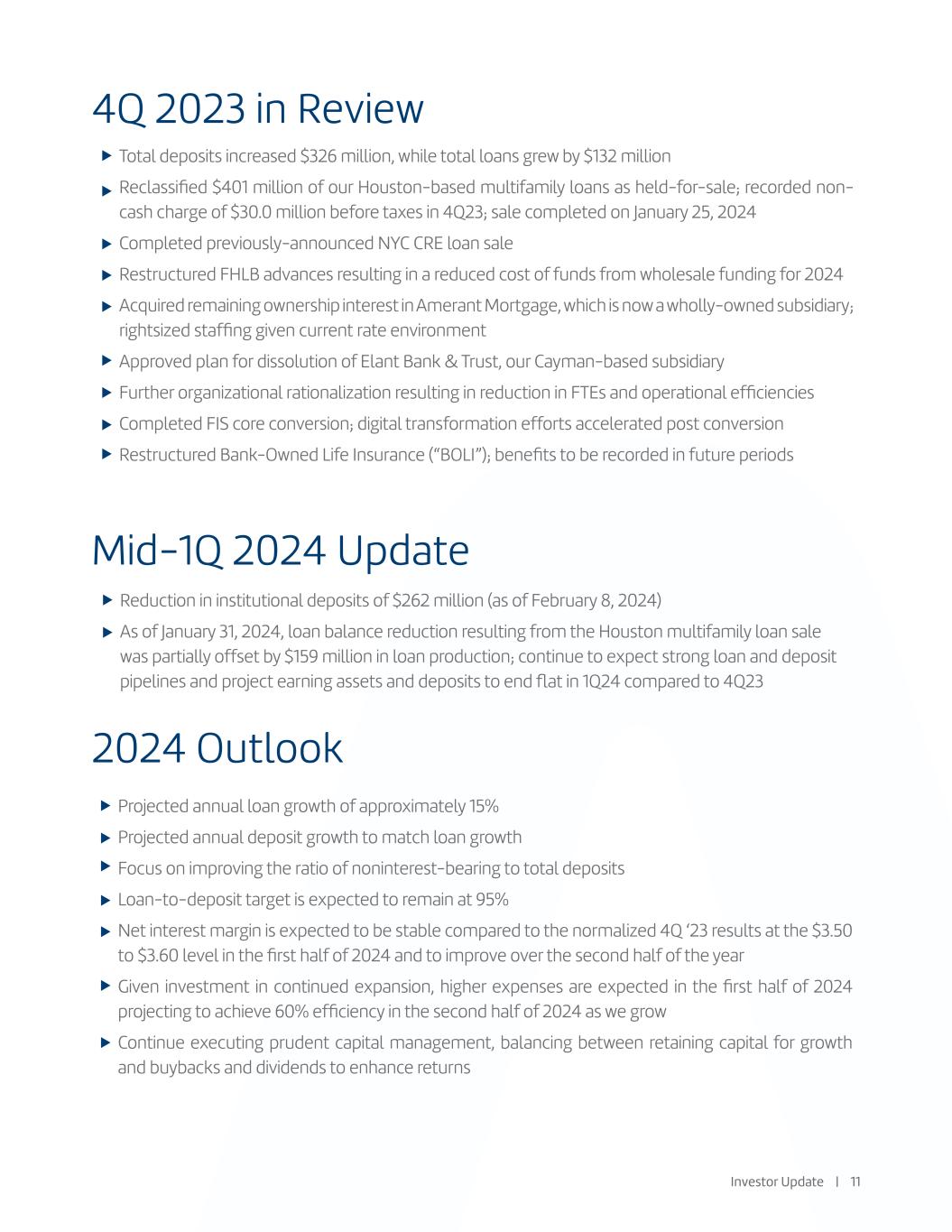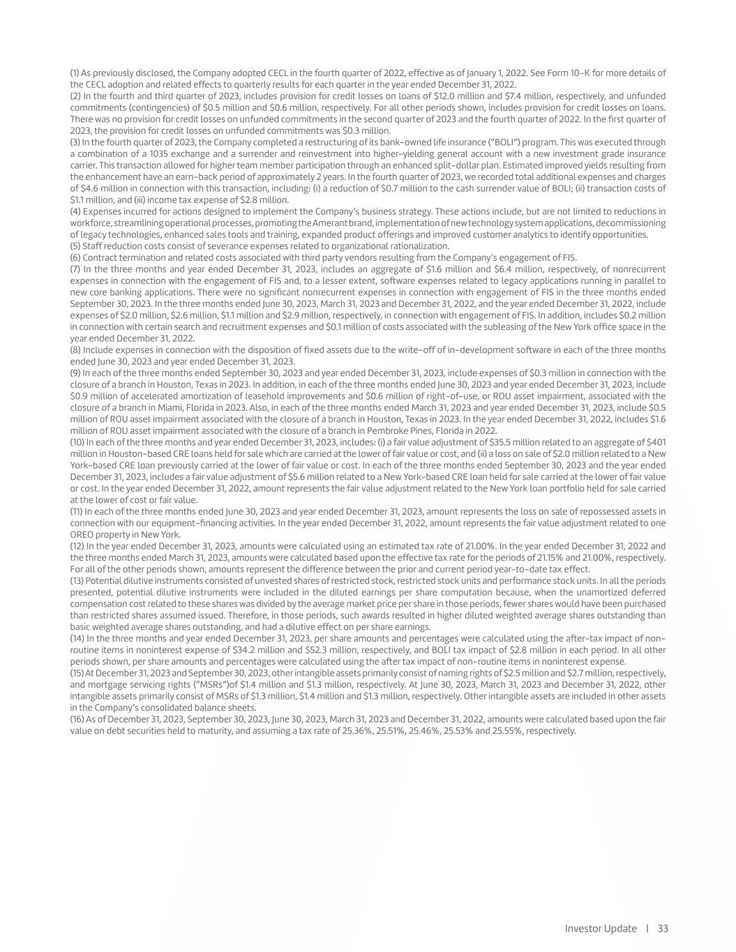 Investor Update | 33 (1) As previously disclosed, the Company adopted CECL in the fourth quarter of 2022, effective as of January 1, 2022. See Form 10-K for more details of the CECL adoption and related effects to quarterly results for each quarter in the year ended December 31, 2022. (2) In the fourth and third quarter of 2023, includes provision for credit losses on loans of $12.0 million and $7.4 million, respectively, and unfunded commitments (contingencies) of $0.5 million and $0.6 million, respectively. For all other periods shown, includes provision for credit losses on loans. There was no provision for credit losses on unfunded commitments in the second quarter of 2023 and the fourth quarter of 2022. In the first quarter of 2023, the provision for credit losses on unfunded commitments was $0.3 million. (3) In the fourth quarter of 2023, the Company completed a restructuring of its bank-owned life insurance (“BOLI”) program. This was executed through a combination of a 1035 exchange and a surrender and reinvestment into higher-yielding general account with a new investment grade insurance carrier. This transaction allowed for higher team member participation through an enhanced split-dollar plan. Estimated improved yields resulting from the enhancement have an earn-back period of approximately 2 years. In the fourth quarter of 2023, we recorded total additional expenses and charges of $4.6 million in connection with this transaction, including: (i) a reduction of $0.7 million to the cash surrender value of BOLI; (ii) transaction costs of $1.1 million, and (iii) income tax expense of $2.8 million. (4) Expenses incurred for actions designed to implement the Company’s business strategy. These actions include, but are not limited to reductions in workforce, streamlining operational processes, promoting the Amerant brand, implementation of new technology system applications, decommissioning of legacy technologies, enhanced sales tools and training, expanded product offerings and improved customer analytics to identify opportunities. (5) Staff reduction costs consist of severance expenses related to organizational rationalization. (6) Contract termination and related costs associated with third party vendors resulting from the Company’s engagement of FIS. (7) In the three months and year ended December 31, 2023, includes an aggregate of $1.6 million and $6.4 million, respectively, of nonrecurrent expenses in connection with the engagement of FIS and, to a lesser extent, software expenses related to legacy applications running in parallel to new core banking applications. There were no significant nonrecurrent expenses in connection with engagement of FIS in the three months ended September 30, 2023. In the three months ended June 30, 2023, March 31, 2023 and December 31, 2022, and the year ended December 31, 2022, include expenses of $2.0 million, $2.6 million, $1.1 million and $2.9 million, respectively, in connection with engagement of FIS. In addition, includes $0.2 million in connection with certain search and recruitment expenses and $0.1 million of costs associated with the subleasing of the New York office space in the year ended December 31, 2022. (8) Include expenses in connection with the disposition of fixed assets due to the write-off of in-development software in each of the three months ended June 30, 2023 and year ended December 31, 2023. (9) In each of the three months ended September 30, 2023 and year ended December 31, 2023, include expenses of $0.3 million in connection with the closure of a branch in Houston, Texas in 2023. In addition, in each of the three months ended June 30, 2023 and year ended December 31, 2023, include $0.9 million of accelerated amortization of leasehold improvements and $0.6 million of right-of-use, or ROU asset impairment, associated with the closure of a branch in Miami, Florida in 2023. Also, in each of the three months ended March 31, 2023 and year ended December 31, 2023, include $0.5 million of ROU asset impairment associated with the closure of a branch in Houston, Texas in 2023. In the year ended December 31, 2022, includes $1.6 million of ROU asset impairment associated with the closure of a branch in Pembroke Pines, Florida in 2022. (10) In each of the three months and year ended December 31, 2023, includes: (i) a fair value adjustment of $35.5 million related to an aggregate of $401 million in Houston-based CRE loans held for sale which are carried at the lower of fair value or cost, and (ii) a loss on sale of $2.0 million related to a New York-based CRE loan previously carried at the lower of fair value or cost. In each of the three months ended September 30, 2023 and the year ended December 31, 2023, includes a fair value adjustment of $5.6 million related to a New York-based CRE loan held for sale carried at the lower of fair value or cost. In the year ended December 31, 2022, amount represents the fair value adjustment related to the New York loan portfolio held for sale carried at the lower of cost or fair value. (11) In each of the three months ended June 30, 2023 and year ended December 31, 2023, amount represents the loss on sale of repossessed assets in connection with our equipment-financing activities. In the year ended December 31, 2022, amount represents the fair value adjustment related to one OREO property in New York. (12) In the year ended December 31, 2023, amounts were calculated using an estimated tax rate of 21.00%. In the year ended December 31, 2022 and the three months ended March 31, 2023, amounts were calculated based upon the effective tax rate for the periods of 21.15% and 21.00%, respectively. For all of the other periods shown, amounts represent the difference between the prior and current period year-to-date tax effect. (13) Potential dilutive instruments consisted of unvested shares of restricted stock, restricted stock units and performance stock units. In all the periods presented, potentia