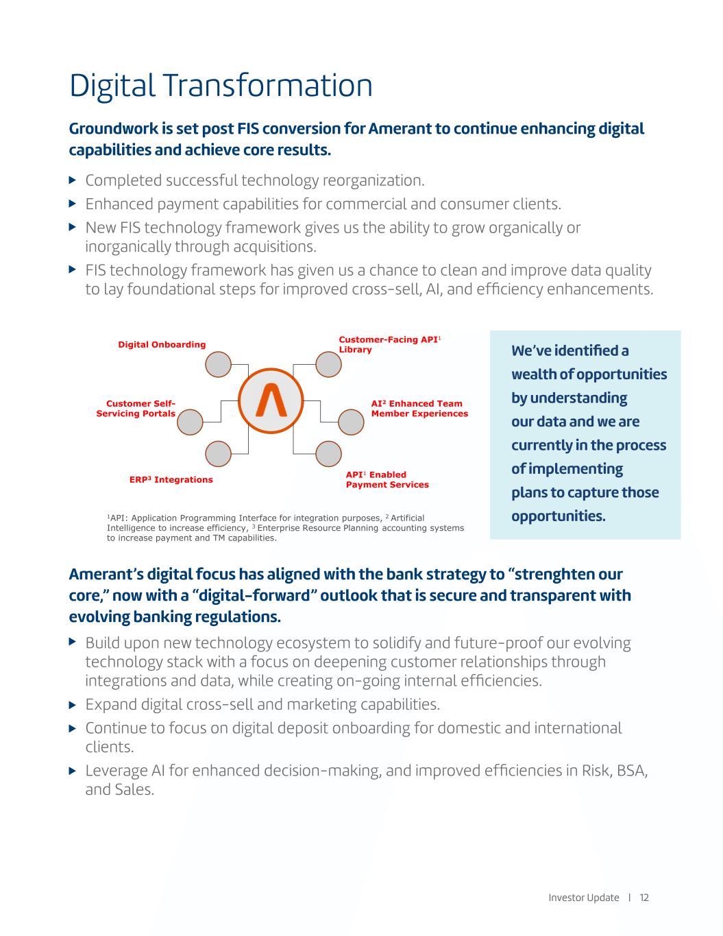 Digital Transformation Groundwork is set post FIS conversion for Amerant to continue enhancing digital capabilities and achieve core results. Amerant’s digital focus has aligned with the bank strategy to “strenghten our core,” now with a “digital-forward” outlook that is secure and transparent with evolving banking regulations. Digital Onboarding Customer-Facing API1 Library Customer Self- Servicing Portals AI2 Enhanced Team Member Experiences ERP3 Integrations API1 Enabled Payment Services 1API: Application Programming Interface for integration purposes, 2 Artificial Intelligence to increase efficiency, 3 Enterprise Resource Planning accounting systems to increase payment and TM capabilities. We’ve identified a wealth of opportunities by understanding our data and we are currently in the process of implementing plans to capture those opportunities. Completed successful technology reorganization. Enhanced payment capabilities for commercial and consumer clients. New FIS technology framework gives us the ability to grow organically or inorganically through acquisitions. FIS technology framework has given us a chance to clean and improve data quality to lay foundational steps for improved cross-sell, AI, and efficiency enhancements. Build upon new technology ecosystem to solidify and future-proof our evolving technology stack with a focus on deepening customer relationships through integrations and data, while creating on-going internal efficiencies. Expand digital cross-sell and marketing capabilities. Continue to focus on digital deposit onboarding for domestic and international clients. Leverage AI for enhanced decision-making, and improved efficiencies in Risk, BSA, and Sales. Investor Update | 12