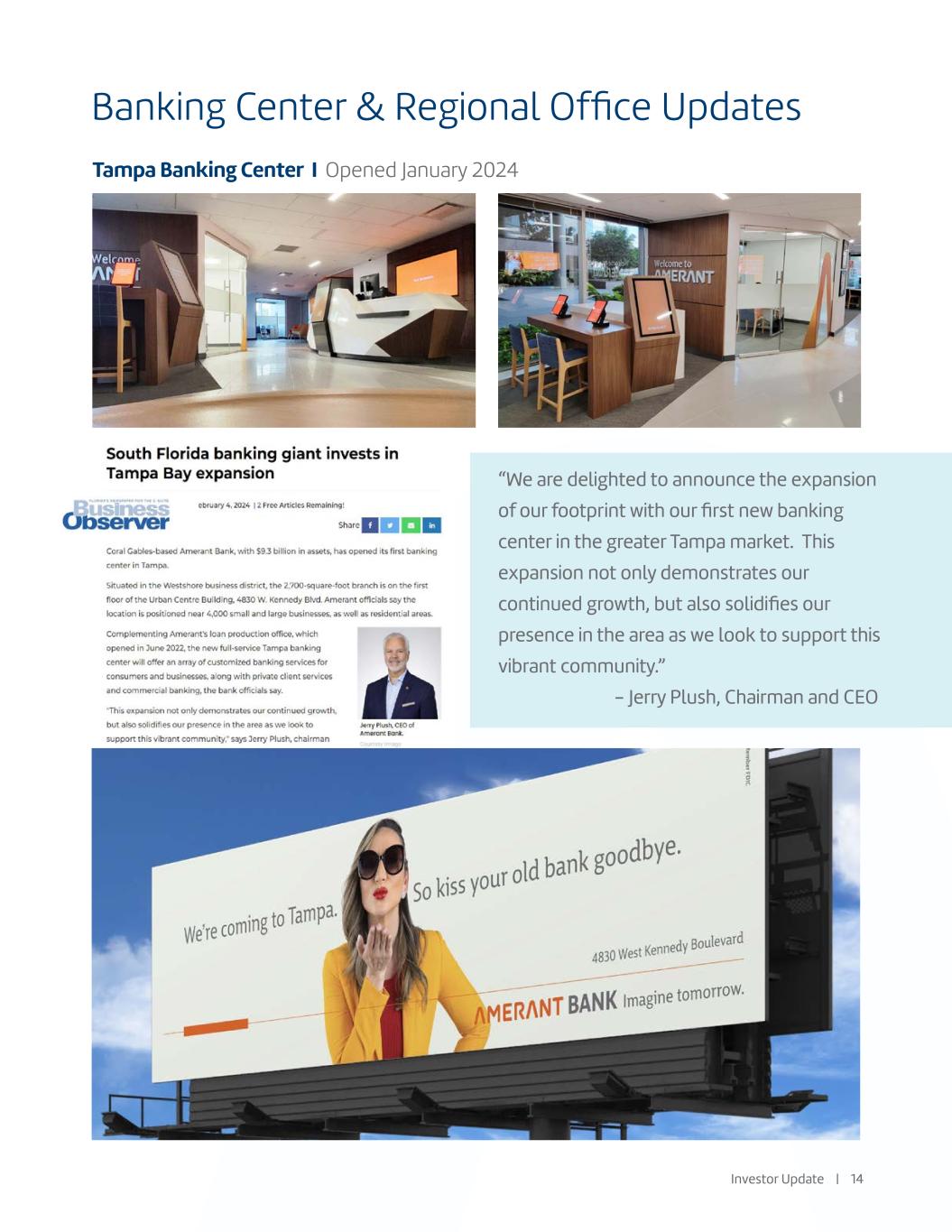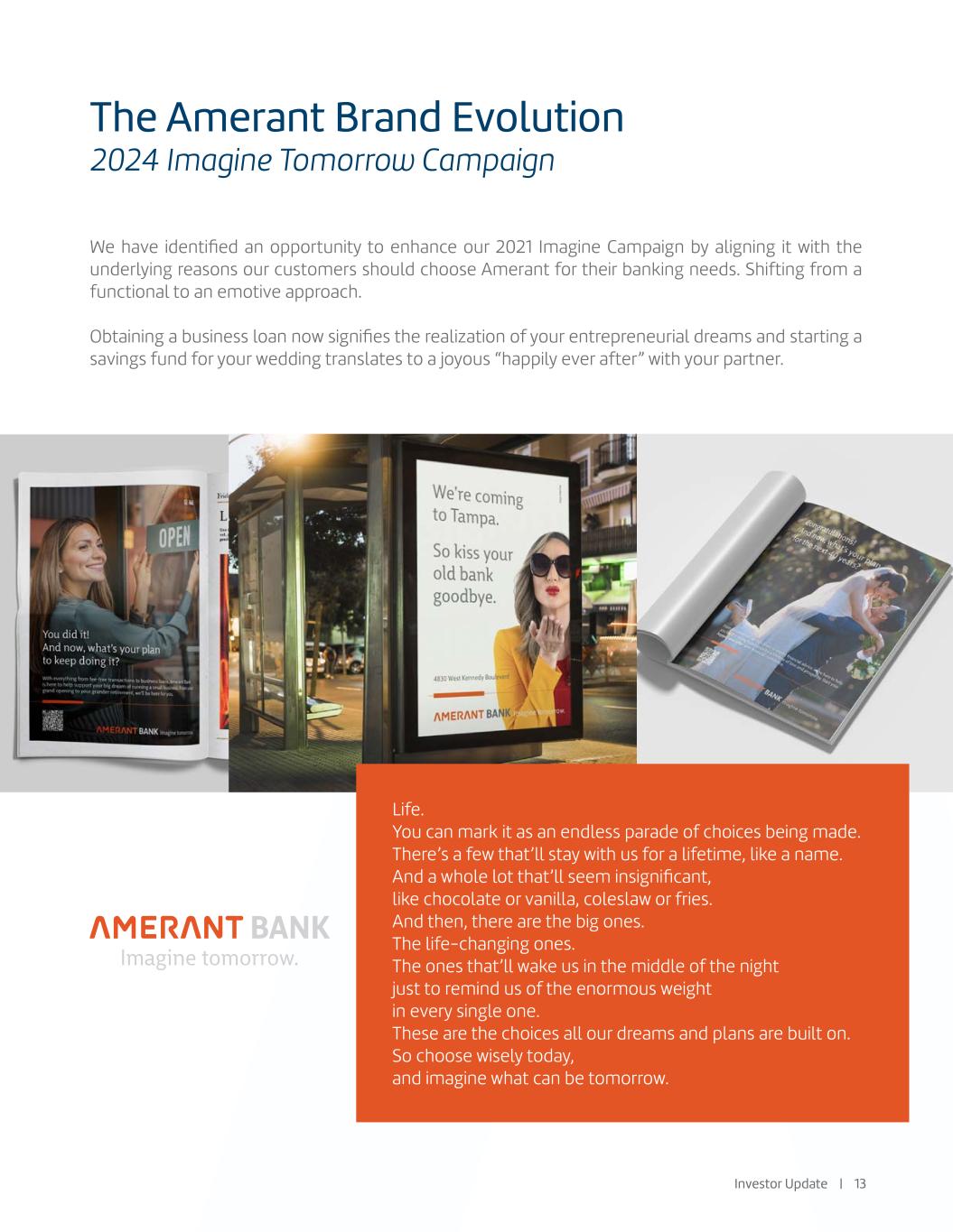 The Amerant Brand Evolution 2024 Imagine Tomorrow Campaign We have identified an opportunity to enhance our 2021 Imagine Campaign by aligning it with the underlying reasons our customers should choose Amerant for their banking needs. Shifting from a functional to an emotive approach. Obtaining a business loan now signifies the realization of your entrepreneurial dreams and starting a savings fund for your wedding translates to a joyous “happily ever after” with your partner. Life. You can mark it as an endless parade of choices being made. There’s a few that’ll stay with us for a lifetime, like a name. And a whole lot that’ll seem insignificant, like chocolate or vanilla, coleslaw or fries. And then, there are the big ones. The life-changing ones. The ones that’ll wake us in the middle of the night just to remind us of the enormous weight in every single one. These are the choices all our dreams and plans are built on. So choose wisely today, and imagine what can be tomorrow. Investor Update | 13