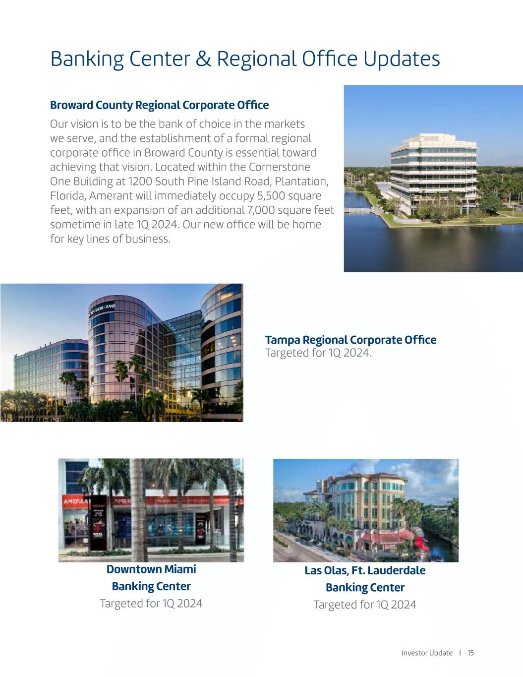 Banking Center & Regional Office Updates Broward County Regional Corporate Office Our vision is to be the bank of choice in the markets we serve, and the establishment of a formal regional corporate office in Broward County is essential toward achieving that vision. Located within the Cornerstone One Building at 1200 South Pine Island Road, Plantation, Florida, Amerant will immediately occupy 5,500 square feet, with an expansion of an additional 7,000 square feet sometime in late 1Q 2024. Our new office will be home for key lines of business. Tampa Regional Corporate Office Targeted for 1Q 2024. Investor Update | 15 Downtown Miami Banking Center Targeted for 1Q 2024 Las Olas, Ft. Lauderdale Banking Center Targeted for 1Q 2024