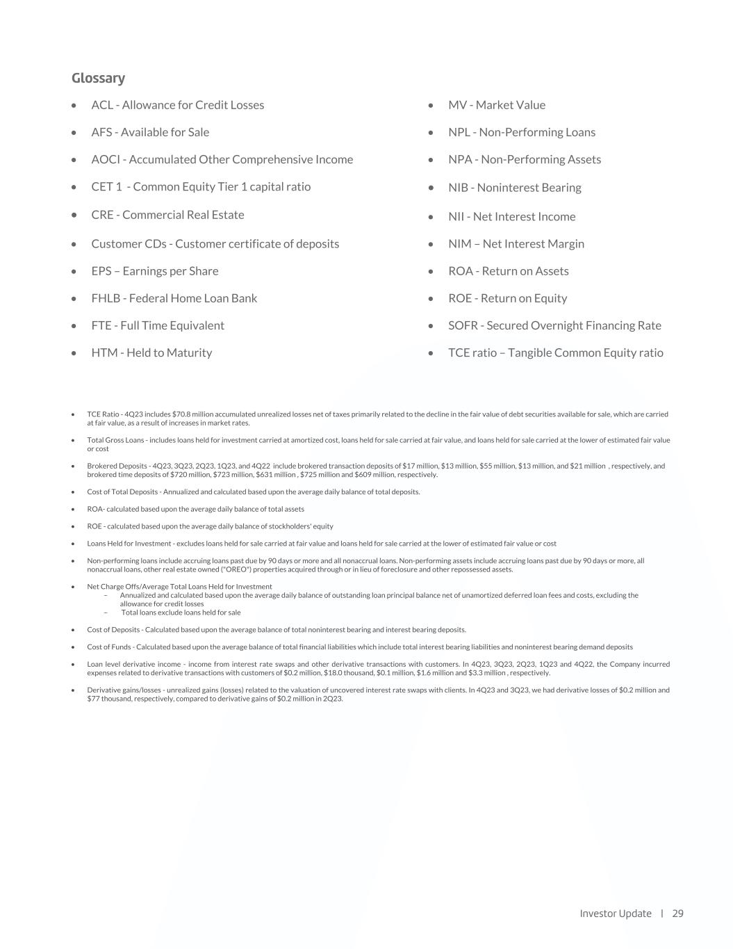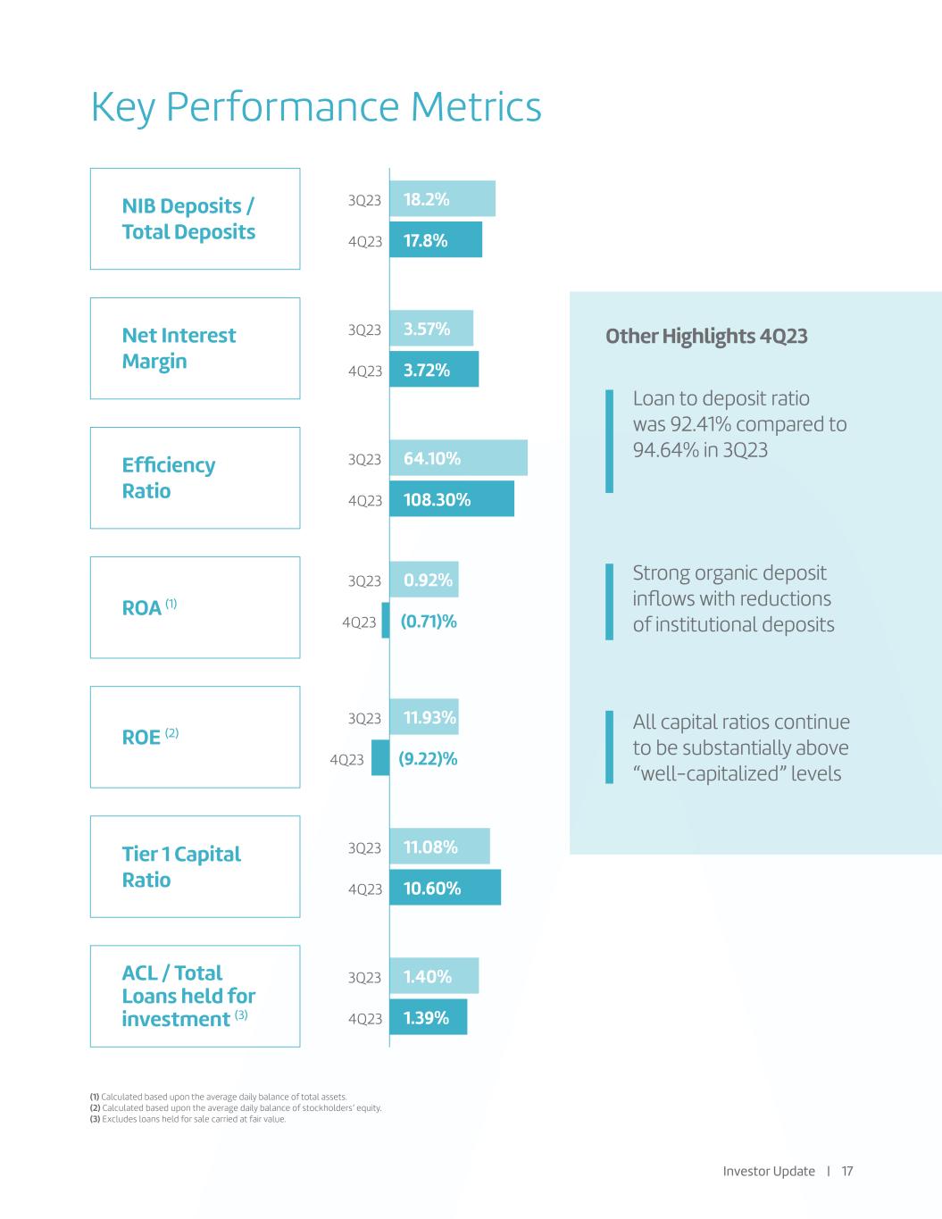Important Notices and Disclosures Forward-Looking Statements This presentation contains “forward-looking statements” including statements with respect to the Company’s objectives, expectations and intentions and other statements that are not historical facts. All statements other than statements of historical fact are statements that could be forward-looking statements. You can identify these forward-looking statements through our use of words such as “may,” “will,” “anticipate,” “assume,” “should,” “indicate,” “would,” “believe,” “contemplate,” “expect,” “estimate,” “continue,” “plan,” “point to,” “project,” “could,” “intend,” “target,” “goals,” “outlooks,” “modeled,” “dedicated,” “create,” and other similar words and expressions of the future. Forward-looking statements, including those relating to our beliefs, plans, objectives, goals, expectations, anticipations, estimates and intentions, involve known and unknown risks, uncertainties and other factors, which may be beyond our control, and which may cause the Company’s actual results, performance, achievements, or financial condition to be materially different from future results, performance, achievements, or financial condition expressed or implied by such forward-looking statements. You should not rely on any forward-looking statements as predictions of future events. You should not expect us to update any forward-looking statements, except as required by law. All written or oral forward-looking statements attributable to us are expressly qualified in their entirety by this cautionary notice, together with those risks and uncertainties described in “Risk factors” in our annual report on Form 10-K for the fiscal year ended December 31, 2022 filed on March 1, 2023 (the “Form 10-K”), our quarterly report on Form 10-Q for the quarter ended March 31, 2023 filed on May 2, 2023, and in our other filings with the U.S. Securities and Exchange Commission (the “SEC”), which are available at the SEC’s website www.sec.gov. Non-GAAP Financial Measures The Company supplements its financial results that are determined in accordance with accounting principles generally accepted in the United States of America (“GAAP”) with non-GAAP financial measures, such as “pre-provision net revenue (PPNR)”, “core pre- provision net revenue (Core PPNR)”, “core noninterest income”, “core noninterest expenses”, “core net income”, “core earnings per share (basic and diluted)”, “core return on assets (Core ROA)”, “core return on equity (Core ROE)”, “core efficiency ratio”, “tangible stockholders’ equity (book value) per common share”, “tangible common equity ratio, adjusted for unrealized losses on debt securities held to maturity”, and “tangible stockholders’ equity (book value) per common share, adjusted for unrealized losses on debt securities held to maturity”, and “tangible stockholders’ book value per common share, adjusted for unrealized losses on securities held to maturity”. This supplemental information is not required by, or is not presented in accordance with GAAP. The Company refers to these financial measures and ratios as “non-GAAP financial measures” and they should not be considered in isolation or as a substitute for the GAAP measures presented herein. We use certain non-GAAP financial measures, including those mentioned above, both to explain our results to shareholders and the investment community and in the internal evaluation and management of our businesses. Our management believes that these non-GAAP financial measures and the information they provide are useful to investors since these measures permit investors to view our performance using the same tools that our management uses to evaluate our past performance and prospects for future performance, especially in light of the additional costs we have incurred in connection with the Company’s restructuring activities that began in 2018 and continued in 2023, including the effect of non-routine items such as the sale of loans and securities and other repossessed assets, the valuation of securities, derivatives, loans held for sale and other real estate owned, impairment of investments, early repayment of FHLB advances, Bank owned life insurance restructure, and other non-recurring actions intended to improve customer service and operating performance. While we believe that these non-GAAP financial measures are useful in evaluating our performance, this information should be considered as supplemental and not as a substitute for or superior to the related financial information prepared in accordance with GAAP. Additionally, these non-GAAP financial measures may differ from similar measures presented by other companies. Appendix 1 reconciles these non-GAAP financial measures to reported GAAP results. Interim Financial Information Unaudited financial information as of and for interim periods, including the three month periods ended September 30, 2023, June 30, 2023, March 31, 2023, and the three and twelve month periods ended December 31, 2023, may not reflect our results of operations for our fiscal year ended, or financial condition as of December 31, 2023, or any other period of time or date. As previously disclosed in the Form 10-K, the Company adopted the new guidance on accounting for current expected credit losses on financial instruments (“CECL”) effective as of January 1, 2022. Quarterly amounts previously reported on our quarterly reports on Form 10-Q for the periods ended March 31, 2022, June 30, 2022 and September 30, 2022 do not reflect the adoption of CECL. In the fourth quarter of 2022, the Company recorded a provision for credit losses totaling $20.9 million, including $11.1 million related to the retroactive effect of adopting CECL for all previous quarterly periods in the year ended December 31,