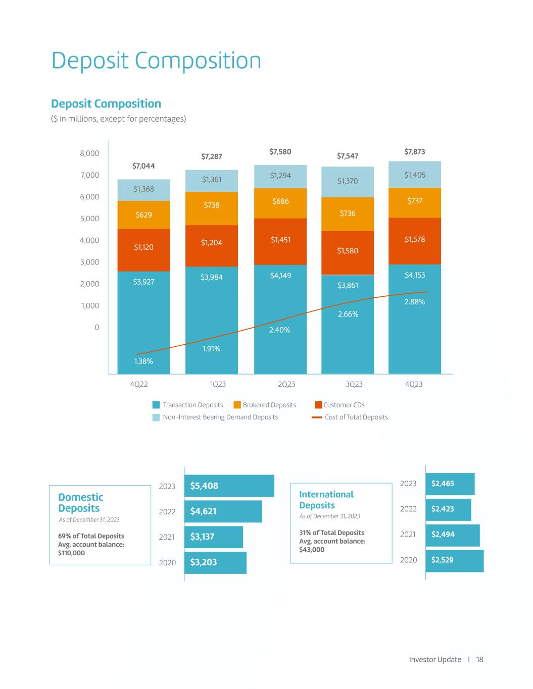 Key Performance Metrics NIB Deposits / Total Deposits Net Interest Margin Efficiency Ratio ROA (1) ROE (2) Tier 1 Capital Ratio ACL / Total Loans held for investment (3) Loan to deposit ratio was 92.41% compared to 94.64% in 3Q23 3Q23 18.2% 3Q23 3.57% 3Q23 64.10% 3Q23 0.92% 3Q23 11.93% 3Q23 11.08% 3Q23 1.40% 4Q23 17.8% 4Q23 3.72% 4Q23 108.30% 4Q23 (0.71)% 4Q23 (9.22)% 4Q23 10.60% 4Q23 1.39% Strong organic deposit inflows with reductions of institutional deposits Other Highlights 4Q23 All capital ratios continue to be substantially above “well-capitalized” levels Investor Update | 17 (1) Calculated based upon the average daily balance of total assets. (2) Calculated based upon the average daily balance of stockholders’ equity. (3) Excludes loans held for sale carried at fair value.