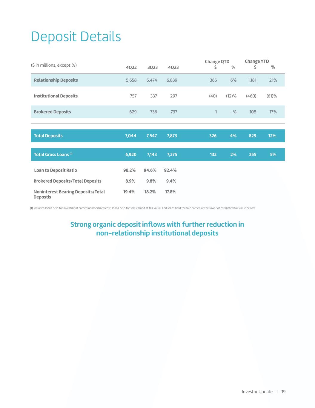 Deposit Details Strong organic deposit inflows with further reduction in non-relationship institutional deposits Relationship Deposits Institutional Deposits Brokered Deposits 4Q22 3Q23 4Q23 Change QTD 5,658 6,474 6,839 365 6% 1,181 21% 757 337 297 (40) (12)% (460) (61)% 629 736 737 1 - % 108 17% (1) Includes loans held for investment carried at amortized cost, loans held for sale carried at fair value, and loans held for sale carried at the lower of estimated fair value or cost Total Deposits 7,044 7,547 7,873 326 4% Total Gross Loans (1) 6,920 7,143 7,275 132 2% Loan to Deposit Ratio 98.2% 94.6% 92.4% Brokered Deposits/Total Deposits 8.9% 9.8% 9.4% Noninterest Bearing Deposits/Total Depostis 19.4% 18.2% 17.8% $ % Change YTD $ % 829 12% 355 5% ($ in millions, except %) Investor Update | 19