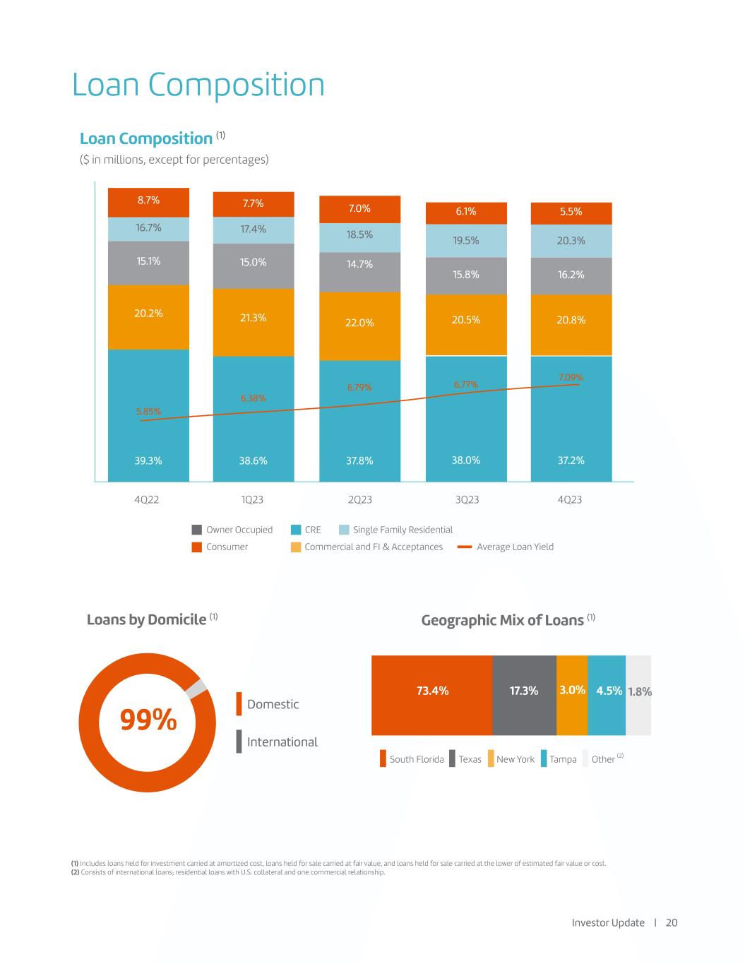 Loan Composition Loan Composition (1) ($ in millions, except for percentages) (1) Includes loans held for investment carried at amortized cost, loans held for sale carried at fair value, and loans held for sale carried at the lower of estimated fair value or cost. (2) Consists of international loans; residential loans with U.S. collateral and one commercial relationship. South Florida Texas New York Tampa Other (2) Owner Occupied CRE Single Family Residential Consumer Commercial and FI & Acceptances Average Loan Yield Loans by Domicile (1) Geographic Mix of Loans (1) 4Q22 1Q23 2Q23 3Q23 4Q23 Domestic International 99% 73.4% 17.3% 3.0% 4.5% 39.3% 38.6% 37.8% 8.7% 16.7% 15.1% 20.2% 5.85% 6.38% 6.79% 7.7% 17.4% 15.0% 21.3% 7.0% 18.5% 14.7% 22.0% 6.1% 19.5% 15.8% 20.5% 38.0% 6.77% 1.8% Investor Update | 20 5.5% 20.3% 16.2% 20.8% 37.2% 7.09%