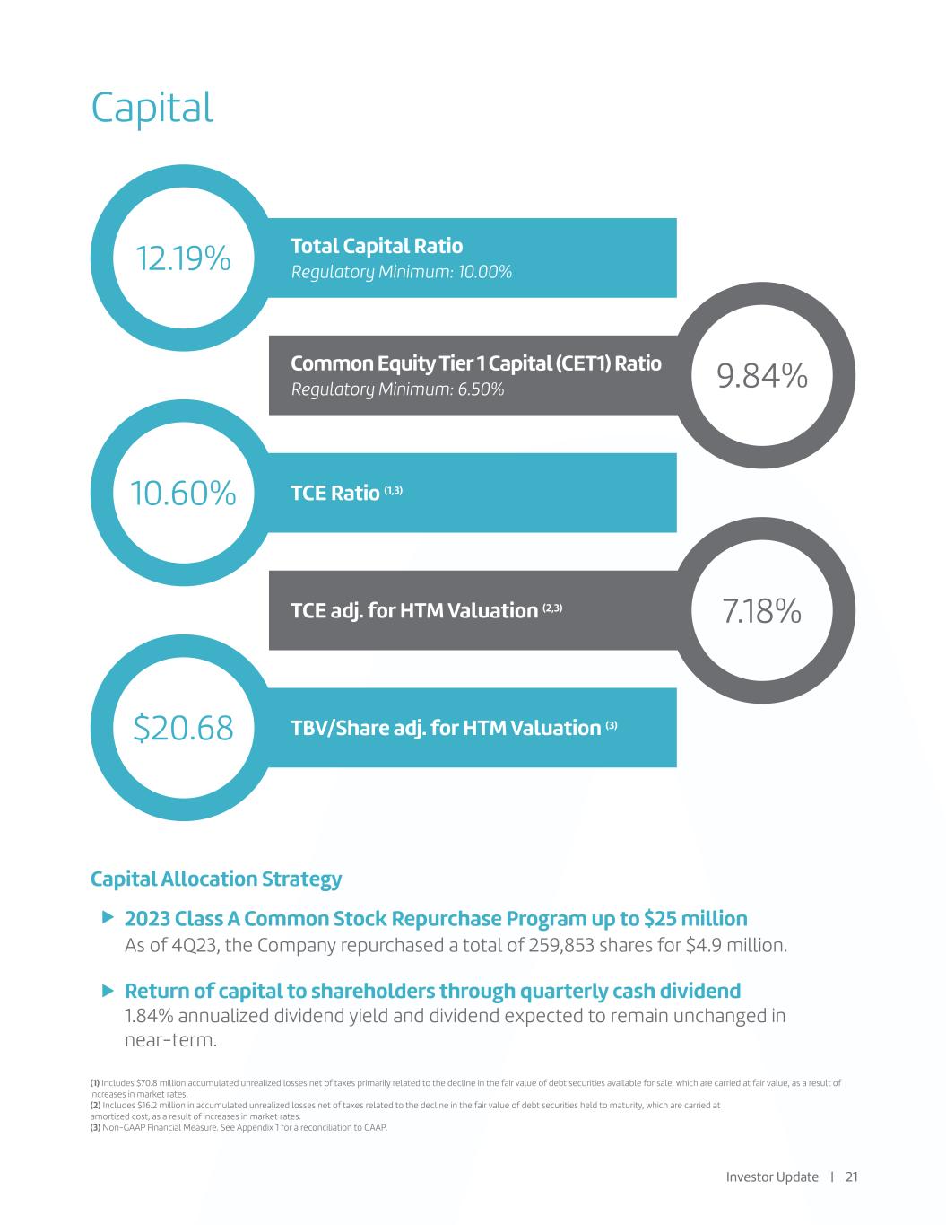 Capital 12.19% 10.60% 9.84% 7.18% $20.68 Total Capital Ratio Regulatory Minimum: 10.00% Common Equity Tier 1 Capital (CET1) Ratio Regulatory Minimum: 6.50% TCE Ratio (1,3) TCE adj. for HTM Valuation (2,3) TBV/Share adj. for HTM Valuation (3) Capital Allocation Strategy 2023 Class A Common Stock Repurchase Program up to $25 million As of 4Q23, the Company repurchased a total of 259,853 shares for $4.9 million. Return of capital to shareholders through quarterly cash dividend 1.84% annualized dividend yield and dividend expected to remain unchanged in near-term. (1) Includes $70.8 million accumulated unrealized losses net of taxes primarily related to the decline in the fair value of debt securities available for sale, which are carried at fair value, as a result of increases in market rates. (2) Includes $16.2 million in accumulated unrealized losses net of taxes related to the decline in the fair value of debt securities held to maturity, which are carried at amortized cost, as a result of increases in market rates. (3) Non-GAAP Financial Measure. See Appendix 1 for a reconciliation to GAAP. Investor Update | 21
