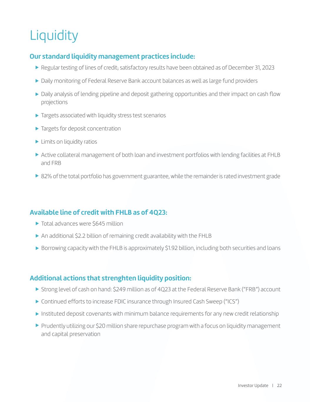 Liquidity Regular testing of lines of credit; satisfactory results have been obtained as of December 31, 2023 Daily monitoring of Federal Reserve Bank account balances as well as large fund providers Daily analysis of lending pipeline and deposit gathering opportunities and their impact on cash flow projections Targets associated with liquidity stress test scenarios Targets for deposit concentration Limits on liquidity ratios Active collateral management of both loan and investment portfolios with lending facilities at FHLB and FRB 82% of the total portfolio has government guarantee, while the remainder is rated investment grade Total advances were $645 million An additional $2.2 billion of remaining credit availability with the FHLB Borrowing capacity with the FHLB is approximately $1.92 billion, including both securities and loans Strong level of cash on hand: $249 million as of 4Q23 at the Federal Reserve Bank (“FRB”) account Continued efforts to increase FDIC insurance through Insured Cash Sweep (“ICS”) Instituted deposit covenants with minimum balance requirements for any new credit relationship Prudently utilizing our $20 million share repurchase program with a focus on liquidity management and capital preservation Our standard liquidity management practices include: Available line of credit with FHLB as of 4Q23: Additional actions that strenghten liquidity position: Investor Update | 22