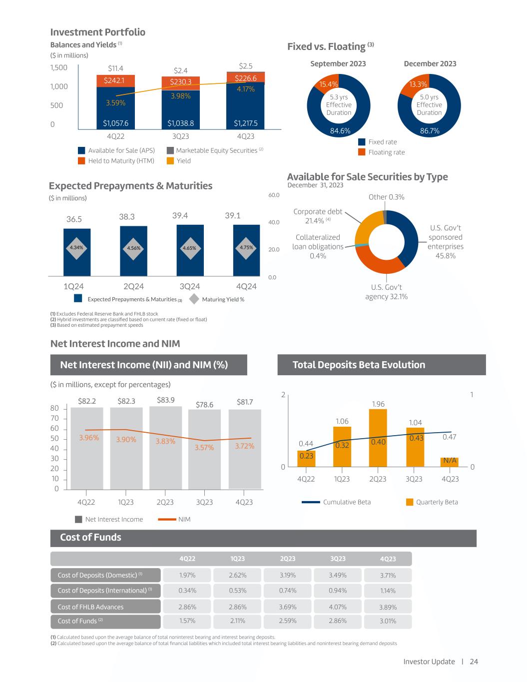 3.72% $81.7 Net Interest Income and NIM ($ in millions, except for percentages) Net Interest Income (NII) and NIM (%) Total Deposits Beta Evolution Cost of Funds (1) Calculated based upon the average balance of total noninterest bearing and interest bearing deposits. (2) Calculated based upon the average balance of total financial liabilities which included total interest bearing liabilities and noninterest bearing demand deposits Cumulative Beta Quarterly Beta Net Interest Income NIM 2 0 80 70 60 50 40 30 20 10 0 1 0 4Q22 4Q22 $78.6 3.57% 3.96% 3.90% 3.83% $82.2 $82.3 $83.9 1Q23 1Q23 1.04 2Q23 2Q23 0.44 3Q23 3Q23 1.06 4Q23 4Q23 1.96 1.97% 0.34% 2.86% 1.57% 2.62% 0.53% 2.86% 2.11% 3.19% 0.74% 3.69% 2.59% 3.49% 0.94% 4.07% 2.86% Cost of Deposits (Domestic) (1) Cost of Deposits (International) (1) Cost of FHLB Advances Cost of Funds (2) 4Q22 1Q23 2Q23 3Q23 0.23 0.32 0.40 0.43 Investment Portfolio Balances and Yields (1) ($ in millions) Available for Sale (APS) Marketable Equity Securities (2) Held to Maturity (HTM) Yield 1,500 1,000 500 0 $11.4 $2.5 4Q22 3Q23 4Q23 $242.1 $230.3 $226.6 $1,057.6 $1,038.8 $1,217.5 3.59% 3.98% 4.17% $2.4 Fixed vs. Floating (3) September 2023 December 2023 5.3 yrs Effective Duration 5.0 yrs Effective Duration Fixed rate Floating rate 15.4% 84.6% 13.3% 86.7% Available for Sale Securities by Type December 31, 2023 Corporate debt 21.4% (4) Collateralized loan obligations 0.4% U.S. Gov’t agency 32.1% U.S. Gov’t sponsored enterprises 45.8% Other 0.3% (1) Excludes Federal Reserve Bank and FHLB stock (2) Hybrid investments are classified based on current rate (fixed or float) (3) Based on estimated prepayment speeds Investor Update | 24 0.47 N/A 4Q23 3.71% 1.14% 3.89% 3.01% Expected Prepayments & Maturities ($ in millions) 36.5 38.3 39.4 39.1 1Q24 2Q24 3Q24 4Q24 0.0 20.0 40.0 60.0