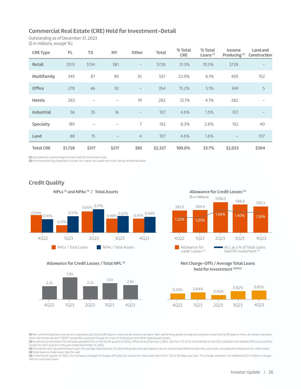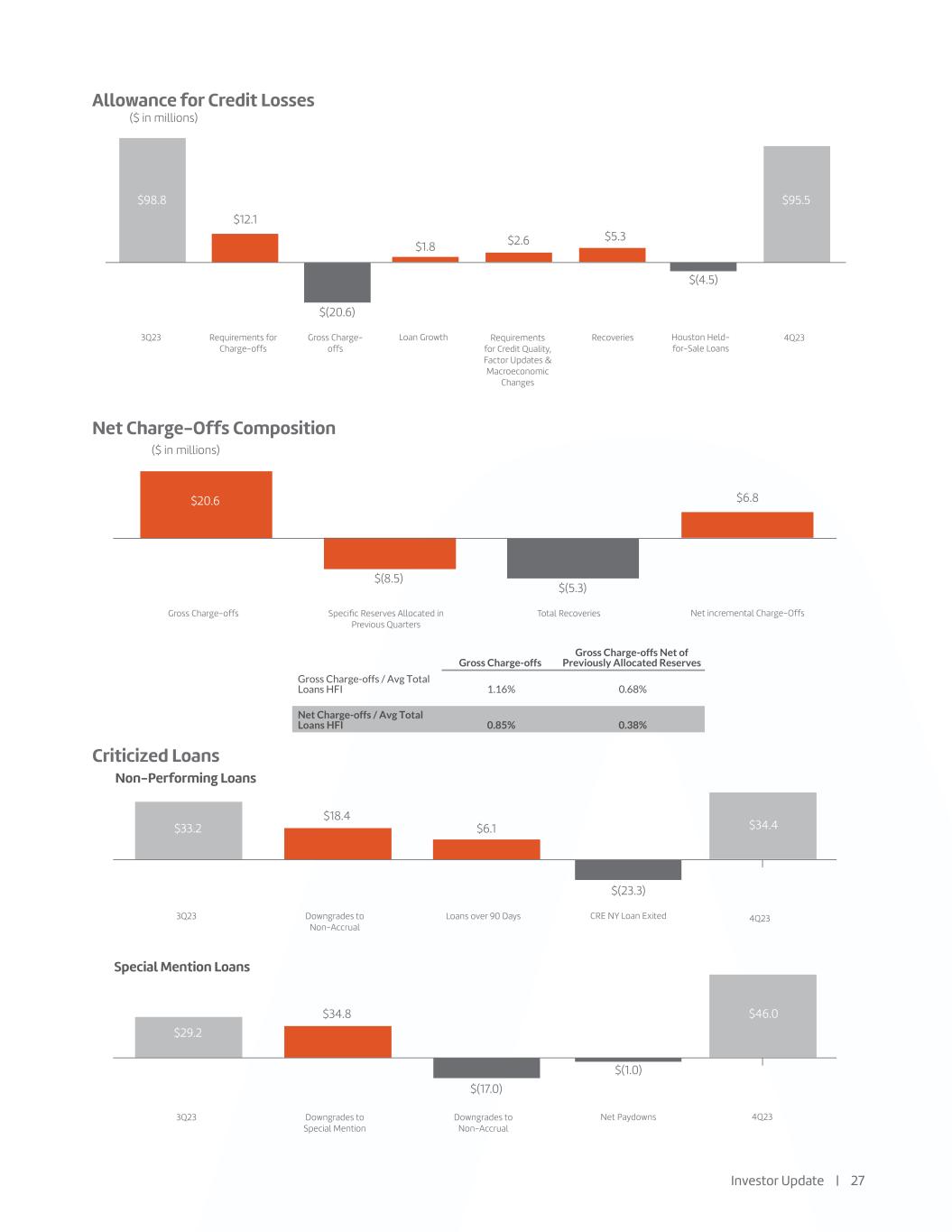 Commercial Real Estate (CRE) Held for Investment-Detail Credit Quality Outstanding as of December 31, 2023 ($ in millions, except %) (1) Calculated as a percentage of loans held for investment only (2) Income producing properties include non-owner occupied and multi-family residential loans CRE Type Retail Multifamily Office Industrial Hotels Specialty Total CRE Land FL TX NY Other Total % Total CRE % Total Loans (1) Income Producing (2) Land and Construction $513 $134 $81 - $728 31.3% 10.5% $728 - 345 87 90 35 557 23.9% 8.1% 405 152 278 46 30 – 354 15.2% 5.1% 349 5 263 – – 19 282 12.1% 4.1% 282 – 56 35 16 – 107 4.6% 1.5% 107 – 185 – – 7 192 8.3% 2.8% 152 40 88 15 – 4 107 4.6% 1.6% – 107 $1,728 $317 $217 $65 $2,327 100.0% 33.7% $2,023 $304 (1) Non-performing loans include accruing loans past due by 90 days or more and all nonaccrual loans. Non-performing assets include accruing loans past due by 90 days or more, all nonaccrual loans, other real estate owned (“OREO”) properties acquired through or in lieu of foreclosure and other repossessed assets. (2) As previously disclosed, the Company adopted CECL in the fourth quarter of 2022, effective as of January 1, 2022. See Form 10-K for more details on the CECL adoption and related effects to quarterly results for each quarter in the year ended December 31, 2022. (3) Annualized and calculated based upon the average daily balance of outstanding loan principal balance net of unamortized deferred loan fees and costs, excluding the allowance for credit losses. (4) Total loans exclude loans held for sale (5) In the fourth quarter of 2022, the Company changed its charge-off policy for consumer unsecured loans from 120 to 90 days past due. This change resulted in an additional $3.4 million in charge- offs for consumer loans. 4Q23 3Q23 3Q23 3Q23 0.46% 0.31% 0.51% 0.65% 0.71% $98.8 3.0x 0.82% $83.5 2.2x 0.59% $84.4 3.8x 0.64% $106.0 2.2x 0.42% 0.41% 0.54% 0.57% 4Q22 4Q23 4Q23 4Q23 1Q23 4Q22 4Q22 4Q22 2Q23 1Q23 1Q23 1Q23 3Q23 2Q23 2Q23 2Q23 ($ in millions) NPLs (1) and NPAs (1) / Total Assets Allowance for Credit Losses / Total NPL (2) Allowance for Credit Losses (2) Net Charge-Offs / Average Total Loans held for investment (3)(4)(5) NPLs / Total Loans NPAs / Total Assets Allowance for credit Losses (2) ACL as a % of Total Loans held for investment (2) 1.40% 1.22% 1.20% 1.48% Investor Update | 26 0.47% 0.56% $95.5 1.39% 2.8x 0.85%