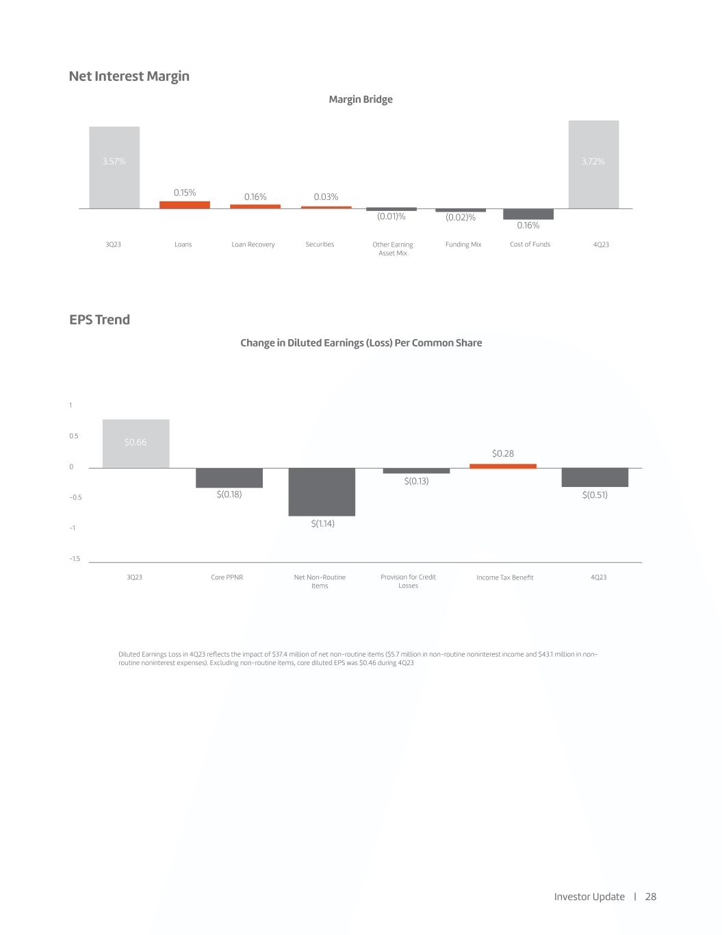 Investor Update | 28 0.16% Margin Bridge 0.15% 0.16% 0.03% (0.02)% Net Interest Margin Securities Other Earning Asset Mix 3Q23 Loans Loan Recovery Cost of Funds 4Q23Funding Mix 3.57% 3.72% (0.01)% $(1.14) Change in Diluted Earnings (Loss) Per Common Share $(0.18) $(0.13) $(0.51) EPS Trend Provision for Credit Losses Income Tax Benefit3Q23 Core PPNR Net Non-Routine Items 4Q23 $0.66 $0.28 1 0.5 0 -0.5 -1 -1.5 Diluted Earnings Loss in 4Q23 reflects the impact of $37.4 million of net non-routine items ($5.7 million in non-routine noninterest income and $43.1 million in non- routine noninterest expenses). Excluding non-routine items, core diluted EPS was $0.46 during 4Q23