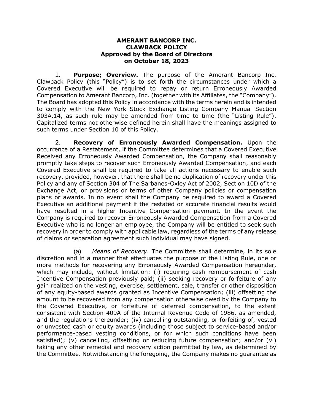 AMERANT BANCORP INC. CLAWBACK POLICY Approved by the Board of Directors on October 18, 2023 1. Purpose; Overview. The purpose of the Amerant Bancorp Inc. Clawback Policy (this “Policy”) is to set forth the circumstances under which a Covered Executive will be required to repay or return Erroneously Awarded Compensation to Amerant Bancorp, Inc. (together with its Affiliates, the “Company”). The Board has adopted this Policy in accordance with the terms herein and is intended to comply with the New York Stock Exchange Listing Company Manual Section 303A.14, as such rule may be amended from time to time (the “Listing Rule”). Capitalized terms not otherwise defined herein shall have the meanings assigned to such terms under Section 10 of this Policy. 2. Recovery of Erroneously Awarded Compensation. Upon the occurrence of a Restatement, if the Committee determines that a Covered Executive Received any Erroneously Awarded Compensation, the Company shall reasonably promptly take steps to recover such Erroneously Awarded Compensation, and each Covered Executive shall be required to take all actions necessary to enable such recovery, provided, however, that there shall be no duplication of recovery under this Policy and any of Section 304 of The Sarbanes-Oxley Act of 2002, Section 10D of the Exchange Act, or provisions or terms of other Company policies or compensation plans or awards. In no event shall the Company be required to award a Covered Executive an additional payment if the restated or accurate financial results would have resulted in a higher Incentive Compensation payment. In the event the Company is required to recover Erroneously Awarded Compensation from a Covered Executive who is no longer an employee, the Company will be entitled to seek such recovery in order to comply with applicable law, regardless of the terms of any release of claims or separation agreement such individual may have signed. (a) Means of Recovery. The Committee shall determine, in its sole discretion and in a manner that effectuates the purpose of the Listing Rule, one or more methods for recovering any Erroneously Awarded Compensation hereunder, which may include, without limitation: (i) requiring cash reimbursement of cash Incentive Compensation previously paid; (ii) seeking recovery or forfeiture of any gain realized on the vesting, exercise, settlement, sale, transfer or other disposition of any equity-based awards granted as Incentive Compensation; (iii) offsetting the amount to be recovered from any compensation otherwise owed by the Company to the Covered Executive, or forfeiture of deferred compensation, to the extent consistent with Section 409A of the Internal Revenue Code of 1986, as amended, and the regulations thereunder; (iv) cancelling outstanding, or forfeiting of, vested or unvested cash or equity awards (including those subject to service-based and/or performance-based vesting conditions, or for which such conditions have been satisfied); (v) cancelling, offsetting or reducing future compensation; and/or (vi) taking any other remedial and recovery action permitted by law, as determined by the Committee. Notwithstanding the foregoing, the Company makes no guarantee as