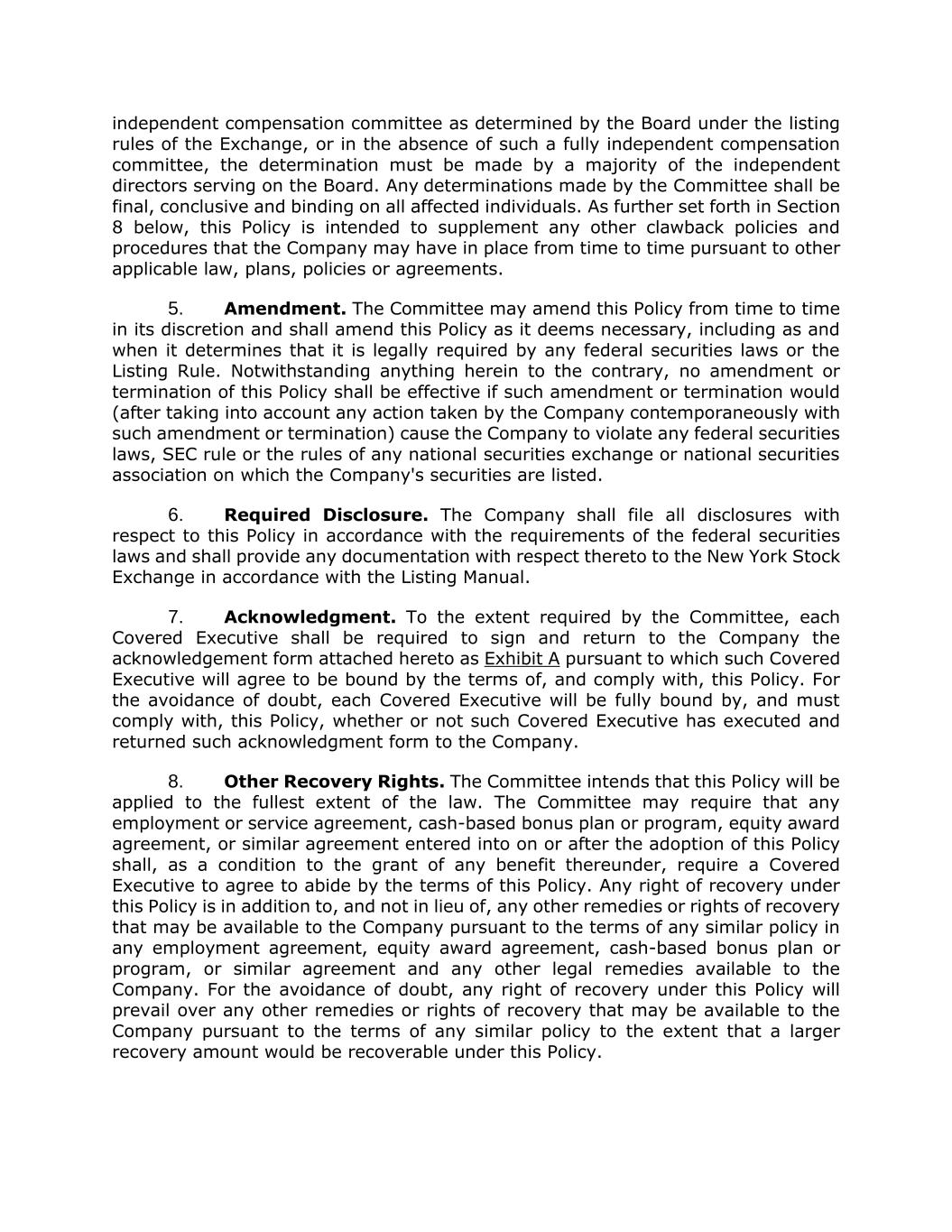 independent compensation committee as determined by the Board under the listing rules of the Exchange, or in the absence of such a fully independent compensation committee, the determination must be made by a majority of the independent directors serving on the Board. Any determinations made by the Committee shall be final, conclusive and binding on all affected individuals. As further set forth in Section 8 below, this Policy is intended to supplement any other clawback policies and procedures that the Company may have in place from time to time pursuant to other applicable law, plans, policies or agreements. 5. Amendment. The Committee may amend this Policy from time to time in its discretion and shall amend this Policy as it deems necessary, including as and when it determines that it is legally required by any federal securities laws or the Listing Rule. Notwithstanding anything herein to the contrary, no amendment or termination of this Policy shall be effective if such amendment or termination would (after taking into account any action taken by the Company contemporaneously with such amendment or termination) cause the Company to violate any federal securities laws, SEC rule or the rules of any national securities exchange or national securities association on which the Company's securities are listed. 6. Required Disclosure. The Company shall file all disclosures with respect to this Policy in accordance with the requirements of the federal securities laws and shall provide any documentation with respect thereto to the New York Stock Exchange in accordance with the Listing Manual. 7. Acknowledgment. To the extent required by the Committee, each Covered Executive shall be required to sign and return to the Company the acknowledgement form attached hereto as Exhibit A pursuant to which such Covered Executive will agree to be bound by the terms of, and comply with, this Policy. For the avoidance of doubt, each Covered Executive will be fully bound by, and must comply with, this Policy, whether or not such Covered Executive has executed and returned such acknowledgment form to the Company. 8. Other Recovery Rights. The Committee intends that this Policy will be applied to the fullest extent of the law. The Committee may require that any employment or service agreement, cash-based bonus plan or program, equity award agreement, or similar agreement entered into on or after the adoption of this Policy shall, as a condition to the grant of any benefit thereunder, require a Covered Executive to agree to abide by the terms of this Policy. Any right of recovery under this Policy is in addition to, and not in lieu of, any other remedies or rights of recovery that may be available to the Company pursuant to the terms of any similar policy in any employment agreement, equity award agreement, cash-based bonus plan or program, or similar agreement and any other legal remedies available to the Company. For the avoidance of doubt, any right of recovery under this Policy will prevail over any other remedies or rights of recovery that may be available to the Company pursuant to the terms of any similar policy to the extent that a larger recovery amount would be recoverable under this Policy.