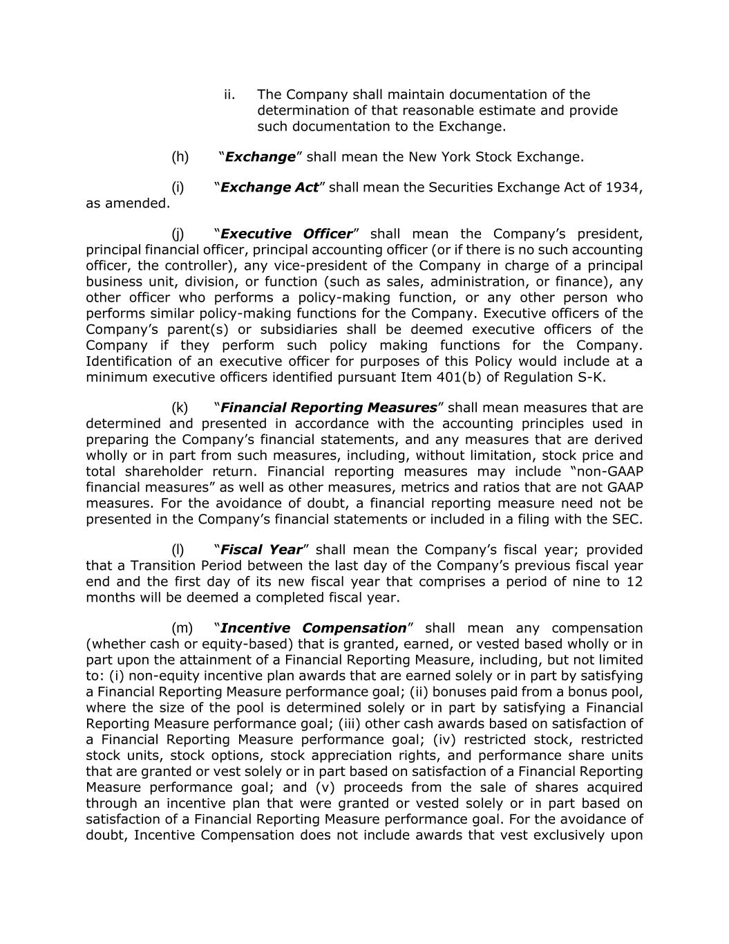 ii. The Company shall maintain documentation of the determination of that reasonable estimate and provide such documentation to the Exchange. (h) “Exchange” shall mean the New York Stock Exchange. (i) “Exchange Act” shall mean the Securities Exchange Act of 1934, as amended. (j) “Executive Officer” shall mean the Company’s president, principal financial officer, principal accounting officer (or if there is no such accounting officer, the controller), any vice-president of the Company in charge of a principal business unit, division, or function (such as sales, administration, or finance), any other officer who performs a policy-making function, or any other person who performs similar policy-making functions for the Company. Executive officers of the Company’s parent(s) or subsidiaries shall be deemed executive officers of the Company if they perform such policy making functions for the Company. Identification of an executive officer for purposes of this Policy would include at a minimum executive officers identified pursuant Item 401(b) of Regulation S-K. (k) “Financial Reporting Measures” shall mean measures that are determined and presented in accordance with the accounting principles used in preparing the Company’s financial statements, and any measures that are derived wholly or in part from such measures, including, without limitation, stock price and total shareholder return. Financial reporting measures may include “non-GAAP financial measures” as well as other measures, metrics and ratios that are not GAAP measures. For the avoidance of doubt, a financial reporting measure need not be presented in the Company’s financial statements or included in a filing with the SEC. (l) “Fiscal Year” shall mean the Company’s fiscal year; provided that a Transition Period between the last day of the Company’s previous fiscal year end and the first day of its new fiscal year that comprises a period of nine to 12 months will be deemed a completed fiscal year. (m) “Incentive Compensation” shall mean any compensation (whether cash or equity-based) that is granted, earned, or vested based wholly or in part upon the attainment of a Financial Reporting Measure, including, but not limited to: (i) non-equity incentive plan awards that are earned solely or in part by satisfying a Financial Reporting Measure performance goal; (ii) bonuses paid from a bonus pool, where the size of the pool is determined solely or in part by satisfying a Financial Reporting Measure performance goal; (iii) other cash awards based on satisfaction of a Financial Reporting Measure performance goal; (iv) restricted stock, restricted stock units, stock options, stock appreciation rights, and performance share units that are granted or vest solely or in part based on satisfaction of a Financial Reporting Measure performance goal; and (v) proceeds from the sale of shares acquired through an incentive plan that were granted or vested solely or in part based on satisfaction of a Financial Reporting Measure performance goal. For the avoidance of doubt, Incentive Compensation does not include awards that vest exclusively upon