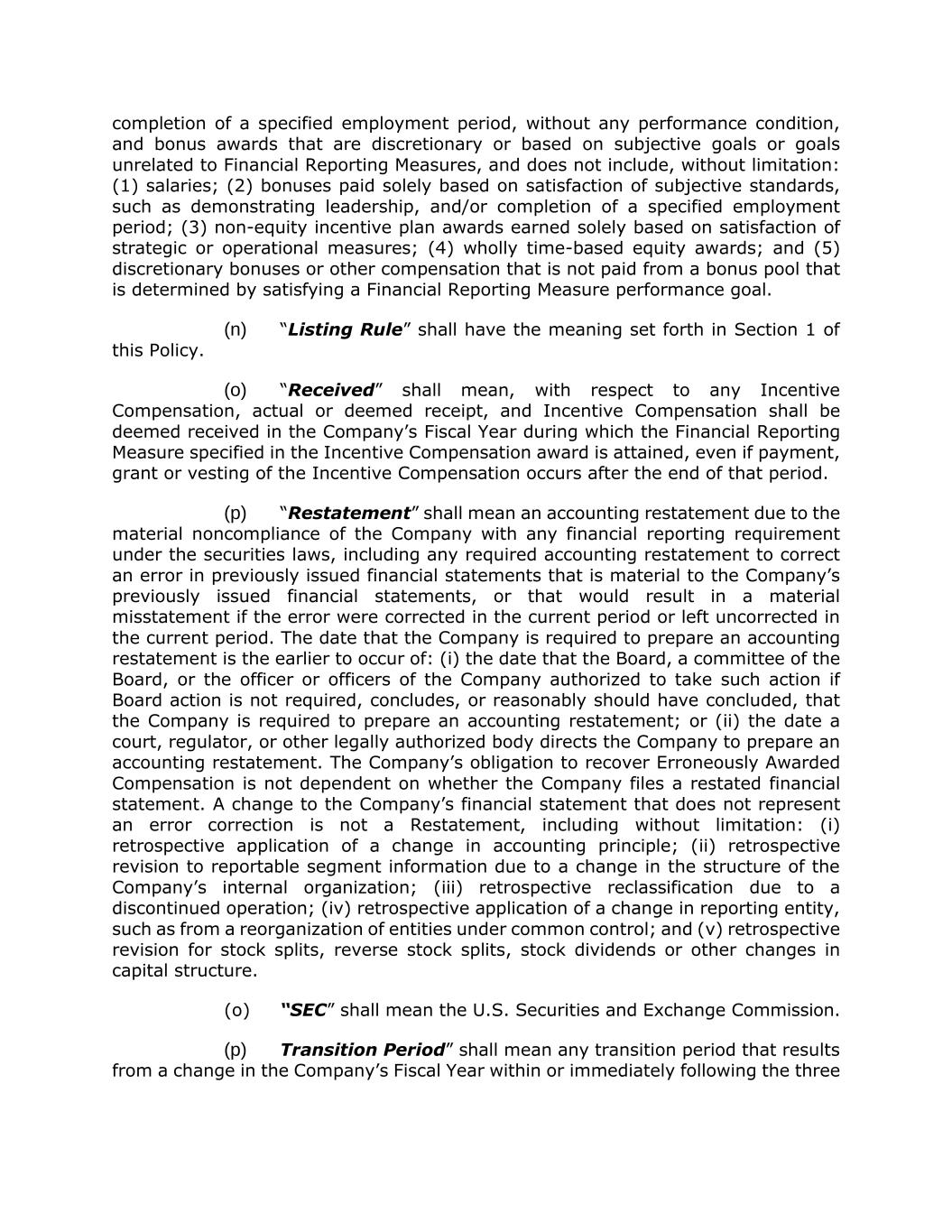 completion of a specified employment period, without any performance condition, and bonus awards that are discretionary or based on subjective goals or goals unrelated to Financial Reporting Measures, and does not include, without limitation: (1) salaries; (2) bonuses paid solely based on satisfaction of subjective standards, such as demonstrating leadership, and/or completion of a specified employment period; (3) non-equity incentive plan awards earned solely based on satisfaction of strategic or operational measures; (4) wholly time-based equity awards; and (5) discretionary bonuses or other compensation that is not paid from a bonus pool that is determined by satisfying a Financial Reporting Measure performance goal. (n) “Listing Rule” shall have the meaning set forth in Section 1 of this Policy. (o) “Received” shall mean, with respect to any Incentive Compensation, actual or deemed receipt, and Incentive Compensation shall be deemed received in the Company’s Fiscal Year during which the Financial Reporting Measure specified in the Incentive Compensation award is attained, even if payment, grant or vesting of the Incentive Compensation occurs after the end of that period. (p) “Restatement” shall mean an accounting restatement due to the material noncompliance of the Company with any financial reporting requirement under the securities laws, including any required accounting restatement to correct an error in previously issued financial statements that is material to the Company’s previously issued financial statements, or that would result in a material misstatement if the error were corrected in the current period or left uncorrected in the current period. The date that the Company is required to prepare an accounting restatement is the earlier to occur of: (i) the date that the Board, a committee of the Board, or the officer or officers of the Company authorized to take such action if Board action is not required, concludes, or reasonably should have concluded, that the Company is required to prepare an accounting restatement; or (ii) the date a court, regulator, or other legally authorized body directs the Company to prepare an accounting restatement. The Company’s obligation to recover Erroneously Awarded Compensation is not dependent on whether the Company files a restated financial statement. A change to the Company’s financial statement that does not represent an error correction is not a Restatement, including without limitation: (i) retrospective application of a change in accounting principle; (ii) retrospective revision to reportable segment information due to a change in the structure of the Company’s internal organization; (iii) retrospective reclassification due to a discontinued operation; (iv) retrospective application of a change in reporting entity, such as from a reorganization of entities under common control; and (v) retrospective revision for stock splits, reverse stock splits, stock dividends or other changes in capital structure. (o) “SEC” shall mean the U.S. Securities and Exchange Commission. (p) Transition Period” shall mean any transition period that results from a change in the Company’s Fiscal Year within or immediately following the three