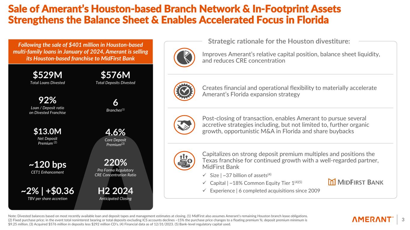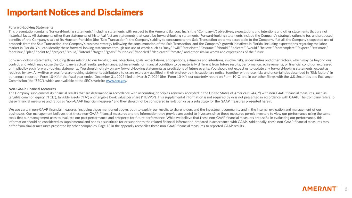 Important Notices and Disclaimers 2 Forward-Looking Statements This presentation contains “forward-looking statements” including statements with respect to the Amerant Bancorp Inc.’s (the “Company’s”) objectives, expectations and intentions and other statements that are not historical facts. All statements other than statements of historical fact are statements that could be forward-looking statements. Forward-looking statements include the Company’s strategic rationale for, and proposed benefits of, the Company’s sale of its Houston franchise (the “Sale Transaction”), the Company’s ability to consummate the Sale Transaction on terms acceptable to the Company, if at all, the Company’s expected use of proceeds from the Sale Transaction, the Company’s business strategy following the consummation of the Sale Transaction, and the Company’s growth initiatives in Florida, including expectations regarding the labor market in Florida. You can identify these forward-looking statements through our use of words such as “may,” “will,” “anticipate,” “assume,” “should,” “indicate,” “would,” “believe,” “contemplate,” “expect,” “estimate,” “continue,” “plan,” “point to,” “project,” “could,” “intend,” “target,” “goals,” “outlooks,” “modeled,” “dedicated,” “create,” and other similar words and expressions of the future. Forward-looking statements, including those relating to our beliefs, plans, objectives, goals, expectations, anticipations, estimates and intentions, involve risks, uncertainties and other factors, which may be beyond our control, and which may cause the Company’s actual results, performance, achievements, or financial condition to be materially different from future results, performance, achievements, or financial condition expressed or implied by such forward-looking statements. You should not rely on any forward-looking statements as predictions of future events. You should not expect us to update any forward-looking statements, except as required by law. All written or oral forward-looking statements attributable to us are expressly qualified in their entirety by this cautionary notice, together with those risks and uncertainties described in “Risk factors” in our annual report on Form 10-K for the fiscal year ended December 31, 2023 filed on March 7, 2024 (the "Form 10-K"), our quarterly report on Form 10-Q, and in our other filings with the U.S. Securities and Exchange Commission (the “SEC”), which are available at the SEC’s website www.sec.gov. Non-GAAP Financial Measures The Company supplements its financial results that are determined in accordance with accounting principles generally accepted in the United States of America (“GAAP”) with non-GAAP financial measures, such as tangible common equity ("TCE"), tangible assets (“TA”) and tangible book value per share ("TBVPS"). This supplemental information is not required by or is not presented in accordance with GAAP. The Company refers to these financial measures and ratios as “non-GAAP financial measures” and they should not be considered in isolation or as a substitute for the GAAP measures presented herein. We use certain non-GAAP financial measures, including those mentioned above, both to explain our results to shareholders and the investment community and in the internal evaluation and management of our businesses. Our management believes that these non-GAAP financial measures and the information they provide are useful to investors since these measures permit investors to view our performance using the same tools that our management uses to evaluate our past performance and prospects for future performance. While we believe that these non-GAAP financial measures are useful in evaluating our performance, this information should be considered as supplemental and not as a substitute for or superior to the related financial information prepared in accordance with GAAP. Additionally, these non-GAAP financial measures may differ from similar measures presented by other companies. Page 13 in the appendix reconciles these non-GAAP financial measures to reported GAAP results.