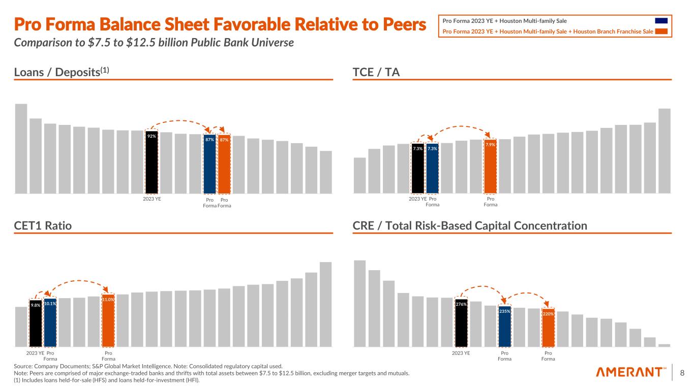 9.8% 10.6% 7.5% 7.3% 7.3% 7.9% 2020 YE 2021 YE 2022 YE 2023 YE Pro Forma Pro Forma 324% 270% 287% 276% 235% 220% 2020 YE 2021 YE 2022 YE 2023 YE Pro Forma Pro Forma 102% 99% 98% 92% 87% 87% 2020 YE 2021 YE 2022 YE 2023 YE Pro Forma Pro Forma 11.7% 12.5% 10.1% 9.8% 10.1% 11.0% 2020 YE 2021 YE 2022 YE 2023 YE Pro Forma Pro Forma Continues Overall Balance Sheet De-Risking Strategy Source: Company Documents; S&P Global Market Intelligence. Note: Consolidated regulatory capital used. (1) Includes loans held-for-sale (HFS) and loans held-for-investment (HFI). 7 Loans / Deposits(1) TCE / TA CRE / Total Risk-Based Capital ConcentrationCET1 Ratio ~120 bps ~60 bps r rma 2023 YE + Houston Multi-family Sale r rma 2023 YE + Houston Multi- family Sale + Houston Branch Franchise Sale r rma 2023 YE + Houston Multi-family Sale r rma 2023 YE + Houston Multi- family Sale + Houston Branch Franchise Sale r rma 2023 YE + Houston Multi-family Sale r rma 2023 YE + Houston Multi- family Sale + Houston Branch Franchise Sale r rma 2023 YE + Houston Multi-family Sale r rma 2023 YE + Houston Multi- family Sale + Houston Branch Franchise Sale