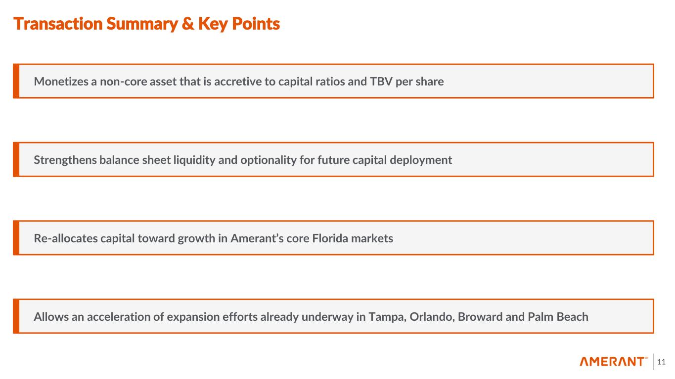 Accelerating Amerant’s Florida Expansion Strategy 10 ✓ Entered into letter of intent for highly visible and accessible space for Palm Beach regional offices and Palm Beach branch ✓ Following recent announcement regarding opening of first Tampa retail location and new regional headquarters, Amerant intends to open between 3 to 5 additional locations over the next 24 months in the surrounding area ✓ Opened new Broward County (Plantation, FL) regional offices this week (week of April 15th) ✓ Executive search underway for Central Florida Market President ✓ Actively recruiting for additional commercial relationship bankers and private banking officers in Broward County, Palm Beach County and greater Tampa markets Metro Area Overall Ranking Salt Lake City, UT 1 Jacksonville, FL 2 Orlando, FL 3 Tampa, FL 4 Oklahoma City, OK 5 Miami, FL 6 Austin, TX 7 Nashville, TN 8 Seattle, WA 9 Dallas, TX 10 Source: Wall Street Journal and Moody’s Analytics of Labor Department data. Note: Labor market strength based on 5 factors: Unemployment Rate, Labor Force Participation, Payroll Change, Change in Labor Force Size, and Change in Averages Weekly Wages. Focus & Expansion in the Nation’s Best Markets Amerant Florida Growth Initiatives U.S. Hottest Job Markets per Moody’s/WSJ April 8th, 2024 Florida has 4 of the top 10 best markets for labor market strength in the United States