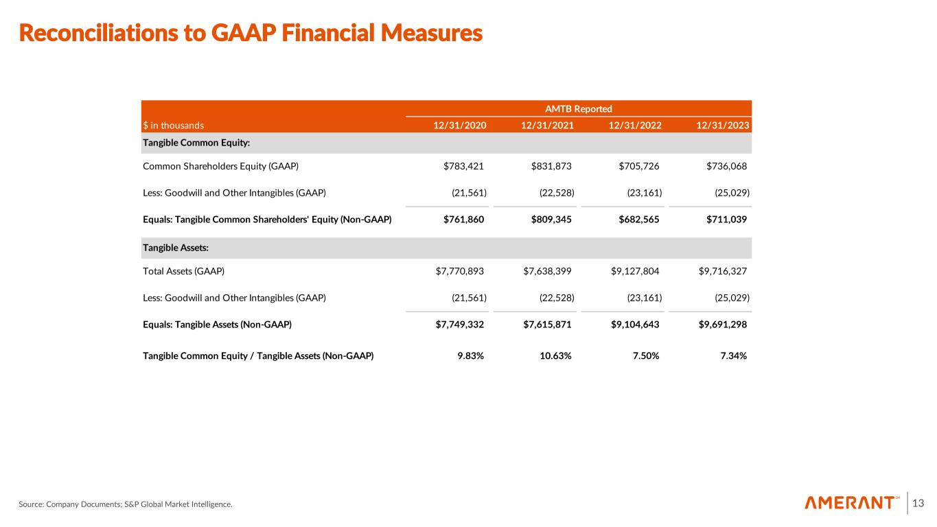 Reconciliations to GAAP Financial Measures Source: Company Documents; S&P Global Market Intelligence. 13 AMTB Reported $ in thousands 12/31/2020 12/31/2021 12/31/2022 12/31/2023 Tangible Common Equity: Common Shareholders Equity (GAAP) $783,421 $831,873 $705,726 $736,068 Less: Goodwill and Other Intangibles (GAAP) (21,561) (22,528) (23,161) (25,029) Equals: Tangible Common Shareholders' Equity (Non-GAAP) $761,860 $809,345 $682,565 $711,039 Tangible Assets: Total Assets (GAAP) $7,770,893 $7,638,399 $9,127,804 $9,716,327 Less: Goodwill and Other Intangibles (GAAP) (21,561) (22,528) (23,161) (25,029) Equals: Tangible Assets (Non-GAAP) $7,749,332 $7,615,871 $9,104,643 $9,691,298 Tangible Common Equity / Tangible Assets (Non-GAAP) 9.83% 10.63% 7.50% 7.34%
