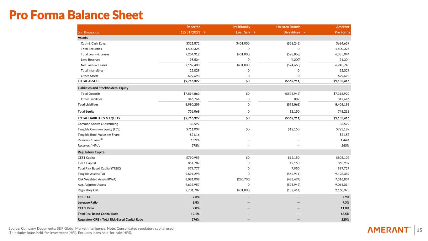 Illustrative Pro Forma Financial Impacts Source: Company Documents; S&P Global Market Intelligence. Note: Common shares outstanding as of 2/15/2024 per company most recent filings. 14 After-tax Equity Impact to AMTB $ in thousands Gross Premium on Sale $13,000 Plus: Gross Provision Release 4,200 Less: Estimated Total Transaction Charges (1,820) Total Pre-tax Adjustments $15,380 Less: Taxes (assumes 21.0%) (3,230) Equals: After-tax Equity Impact to AMTB $12,150 Common Shares Outstanding 33,597 Estimated Per Share TCE Impact $0.36
