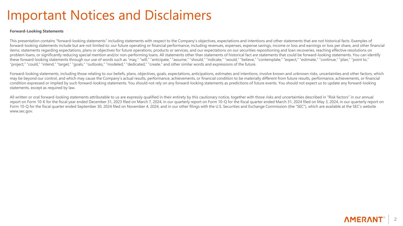 2 Important Notices and Disclaimers Forward-Looking Statements This presentation contains “forward-looking statements” including statements with respect to the Company’s objectives, expectations and intentions and other statements that are not historical facts. Examples of forward-looking statements include but are not limited to: our future operating or financial performance, including revenues, expenses, expense savings, income or loss and earnings or loss per share, and other financial items; statements regarding expectations, plans or objectives for future operations, products or services, and our expectations on our securities repositioning and loan recoveries, reaching effective resolutions on problem loans, or significantly reducing special mention and/or non-performing loans. All statements other than statements of historical fact are statements that could be forward-looking statements. You can identify these forward-looking statements through our use of words such as “may,” “will,” “anticipate,” “assume,” “should,” “indicate,” “would,” “believe,” “contemplate,” “expect,” “estimate,” “continue,” “plan,” “point to,” “project,” “could,” “intend,” “target,” “goals,” “outlooks,” “modeled,” “dedicated,” “create,” and other similar words and expressions of the future. Forward-looking statements, including those relating to our beliefs, plans, objectives, goals, expectations, anticipations, estimates and intentions, involve known and unknown risks, uncertainties and other factors, which may be beyond our control, and which may cause the Company’s actual results, performance, achievements, or financial condition to be materially different from future results, performance, achievements, or financial condition expressed or implied by such forward-looking statements. You should not rely on any forward-looking statements as predictions of future events. You should not expect us to update any forward-looking statements, except as required by law. All written or oral forward-looking statements attributable to us are expressly qualified in their entirety by this cautionary notice, together with those risks and uncertainties described in “Risk factors” in our annual report on Form 10-K for the fiscal year ended December 31, 2023 filed on March 7, 2024, in our quarterly report on Form 10-Q for the fiscal quarter ended March 31, 2024 filed on May 3, 2024, in our quarterly report on Form 10-Q for the fiscal quarter ended September 30, 2024 filed on November 4, 2024, and in our other filings with the U.S. Securities and Exchange Commission (the “SEC”), which are available at the SEC’s website www.sec.gov.