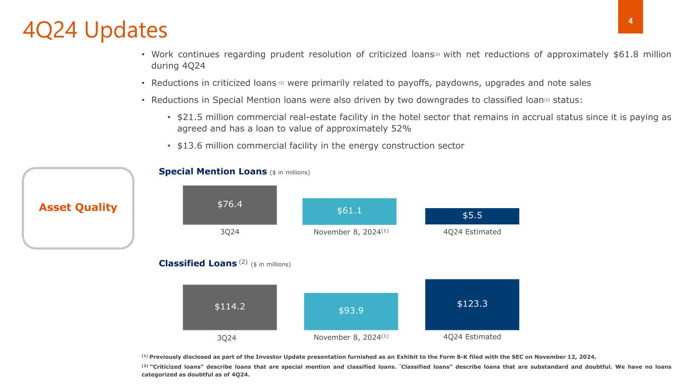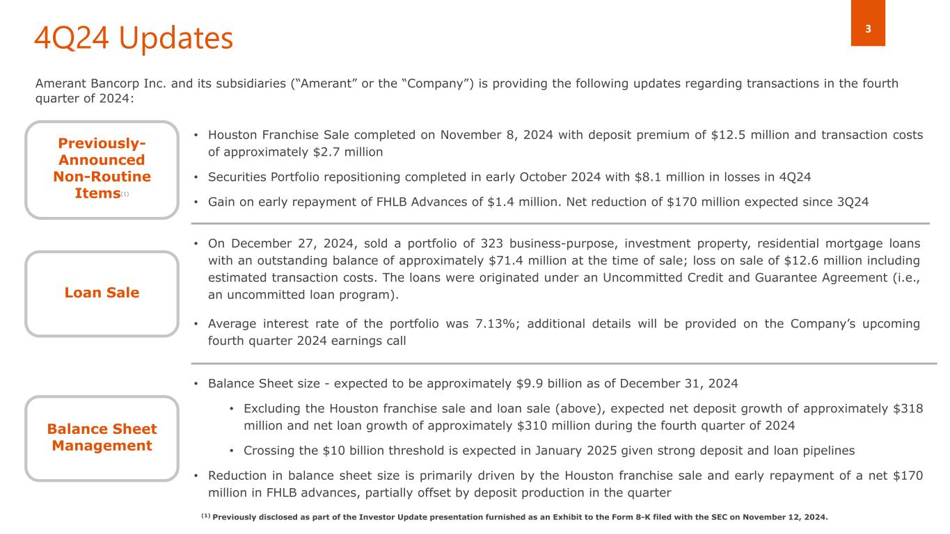3 4Q24 Updates • On December 27, 2024, sold a portfolio of 323 business-purpose, investment property, residential mortgage loans with an outstanding balance of approximately $71.4 million at the time of sale; loss on sale of $12.6 million including estimated transaction costs. The loans were originated under an Uncommitted Credit and Guarantee Agreement (i.e., an uncommitted loan program). • Average interest rate of the portfolio was 7.13%; additional details will be provided on the Company’s upcoming fourth quarter 2024 earnings call Loan Sale • Balance Sheet size - expected to be approximately $9.9 billion as of December 31, 2024 • Excluding the Houston franchise sale and loan sale (above), expected net deposit growth of approximately $318 million and net loan growth of approximately $310 million during the fourth quarter of 2024 • Crossing the $10 billion threshold is expected in January 2025 given strong deposit and loan pipelines • Reduction in balance sheet size is primarily driven by the Houston franchise sale and early repayment of a net $170 million in FHLB advances, partially offset by deposit production in the quarter Balance Sheet Management Amerant Bancorp Inc. and its subsidiaries (“Amerant” or the “Company”) is providing the following updates regarding transactions in the fourth quarter of 2024: Previously- Announced Non-Routine Items(1) • Houston Franchise Sale completed on November 8, 2024 with deposit premium of $12.5 million and transaction costs of approximately $2.7 million • Securities Portfolio repositioning completed in early October 2024 with $8.1 million in losses in 4Q24 • Gain on early repayment of FHLB Advances of $1.4 million. Net reduction of $170 million expected since 3Q24 (1) Previously disclosed as part of the Investor Update presentation furnished as an Exhibit to the Form 8-K filed with the SEC on November 12, 2024.