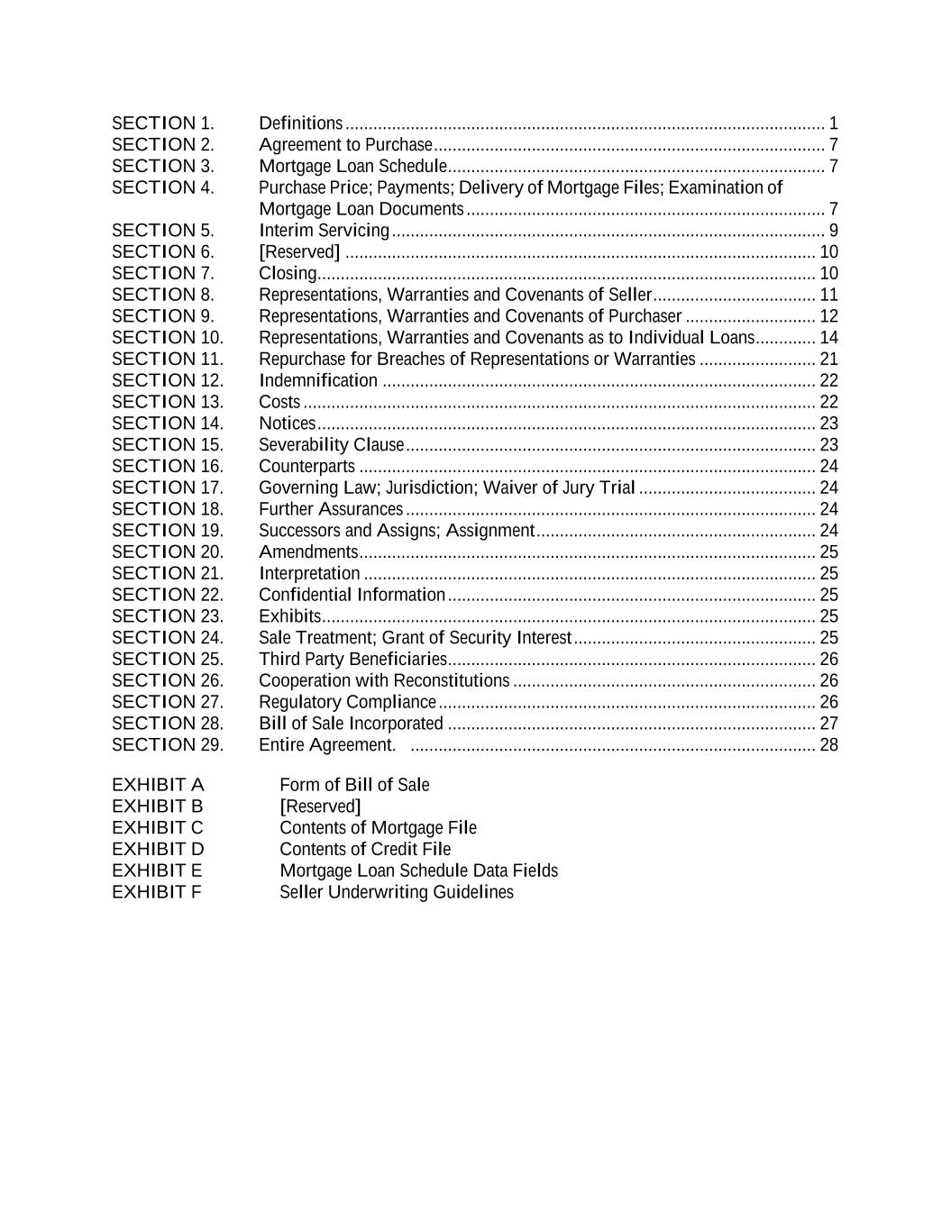 SECTION 1. Definitions ....................................................................................................... 1 SECTION 2. Agreement to Purchase .................................................................................... 7 SECTION 3. Mortgage Loan Schedule ................................................................................. 7 SECTION 4. Purchase Price; Payments; Delivery of Mortgage Files; Examination of Mortgage Loan Documents ............................................................................. 7 SECTION 5. Interim Servicing ............................................................................................. 9 SECTION 6. [Reserved] ..................................................................................................... 10 SECTION 7. Closing ........................................................................................................... 10 SECTION 8. Representations, Warranties and Covenants of Seller ................................... 11 SECTION 9. Representations, Warranties and Covenants of Purchaser ............................ 12 SECTION 10. Representations, Warranties and Covenants as to Individual Loans ............. 14 SECTION 11. Repurchase for Breaches of Representations or Warranties ......................... 21 SECTION 12. Indemnification ............................................................................................. 22 SECTION 13. Costs .............................................................................................................. 22 SECTION 14. Notices ........................................................................................................... 23 SECTION 15. Severability Clause ........................................................................................ 23 SECTION 16. Counterparts .................................................................................................. 24 SECTION 17. Governing Law; Jurisdiction; Waiver of Jury Trial ...................................... 24 SECTION 18. Further Assurances ........................................................................................ 24 SECTION 19. Successors and Assigns; Assignment ............................................................ 24 SECTION 20. Amendments .................................................................................................. 25 SECTION 21. Interpretation ................................................................................................. 25 SECTION 22. Confidential Information ............................................................................... 25 SECTION 23. Exhibits .......................................................................................................... 25 SECTION 24. Sale Treatment; Grant of Security Interest .................................................... 25 SECTION 25. Third Party Beneficiaries ............................................................................... 26 SECTION 26. Cooperation with Reconstitutions ................................................................. 26 SECTION 27. Regulatory Compliance ................................................................................. 26 SECTION 28. Bill of Sale Incorporated ............................................................................... 27 SECTION 29. Entire Agreement. ....................................................................................... 28 EXHIBIT A Form of Bill of Sale EXHIBIT B [Reserved] EXHIBIT C Contents of Mortgage File EXHIBIT D Contents of Credit File EXHIBIT E Mortgage Loan Schedule Data Fields EXHIBIT F Seller Underwriting Guidelines