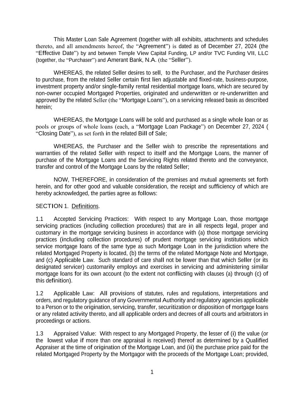 1 This Master Loan Sale Agreement (together with all exhibits, attachments and schedules thereto, and all amendments hereof, the “Agreement”) is dated as of December 27, 2024 (the “Effective Date”) by and between Temple View Capital Funding, LP and/or TVC Funding VII, LLC (together, the “Purchaser”) and Amerant Bank, N.A. (the “Seller”). WHEREAS, the related Seller desires to sell, to the Purchaser, and the Purchaser desires to purchase, from the related Seller certain first lien adjustable and fixed-rate, business-purpose, investment property and/or single-family rental residential mortgage loans, which are secured by non-owner occupied Mortgaged Properties, originated and underwritten or re-underwritten and approved by the related Seller (the “Mortgage Loans”), on a servicing released basis as described herein; WHEREAS, the Mortgage Loans will be sold and purchased as a single whole loan or as pools or groups of whole loans (each, a “Mortgage Loan Package”) on December 27, 2024 ( “Closing Date”), as set forth in the related Bill of Sale; WHEREAS, the Purchaser and the Seller wish to prescribe the representations and warranties of the related Seller with respect to itself and the Mortgage Loans, the manner of purchase of the Mortgage Loans and the Servicing Rights related thereto and the conveyance, transfer and control of the Mortgage Loans by the related Seller; NOW, THEREFORE, in consideration of the premises and mutual agreements set forth herein, and for other good and valuable consideration, the receipt and sufficiency of which are hereby acknowledged, the parties agree as follows: SECTION 1. Definitions. 1.1 Accepted Servicing Practices: With respect to any Mortgage Loan, those mortgage servicing practices (including collection procedures) that are in all respects legal, proper and customary in the mortgage servicing business in accordance with (a) those mortgage servicing practices (including collection procedures) of prudent mortgage servicing institutions which service mortgage loans of the same type as such Mortgage Loan in the jurisdiction where the related Mortgaged Property is located, (b) the terms of the related Mortgage Note and Mortgage, and (c) Applicable Law. Such standard of care shall not be lower than that which Seller (or its designated servicer) customarily employs and exercises in servicing and administering similar mortgage loans for its own account (to the extent not conflicting with clauses (a) through (c) of this definition). 1.2 Applicable Law: All provisions of statutes, rules and regulations, interpretations and orders, and regulatory guidance of any Governmental Authority and regulatory agencies applicable to a Person or to the origination, servicing, transfer, securitization or disposition of mortgage loans or any related activity thereto, and all applicable orders and decrees of all courts and arbitrators in proceedings or actions. 1.3 Appraised Value: With respect to any Mortgaged Property, the lesser of (i) the value (or the lowest value if more than one appraisal is received) thereof as determined by a Qualified Appraiser at the time of origination of the Mortgage Loan, and (ii) the purchase price paid for the related Mortgaged Property by the Mortgagor with the proceeds of the Mortgage Loan; provided,