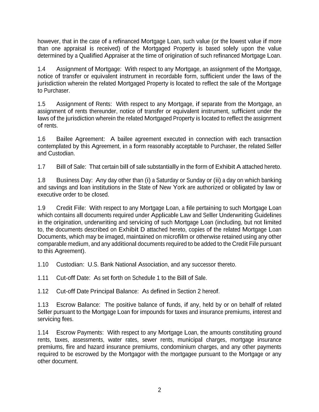 2 however, that in the case of a refinanced Mortgage Loan, such value (or the lowest value if more than one appraisal is received) of the Mortgaged Property is based solely upon the value determined by a Qualified Appraiser at the time of origination of such refinanced Mortgage Loan. 1.4 Assignment of Mortgage: With respect to any Mortgage, an assignment of the Mortgage, notice of transfer or equivalent instrument in recordable form, sufficient under the laws of the jurisdiction wherein the related Mortgaged Property is located to reflect the sale of the Mortgage to Purchaser. 1.5 Assignment of Rents: With respect to any Mortgage, if separate from the Mortgage, an assignment of rents thereunder, notice of transfer or equivalent instrument, sufficient under the laws of the jurisdiction wherein the related Mortgaged Property is located to reflect the assignment of rents. 1.6 Bailee Agreement: A bailee agreement executed in connection with each transaction contemplated by this Agreement, in a form reasonably acceptable to Purchaser, the related Seller and Custodian. 1.7 Bill of Sale: That certain bill of sale substantially in the form of Exhibit A attached hereto. 1.8 Business Day: Any day other than (i) a Saturday or Sunday or (ii) a day on which banking and savings and loan institutions in the State of New York are authorized or obligated by law or executive order to be closed. 1.9 Credit File: With respect to any Mortgage Loan, a file pertaining to such Mortgage Loan which contains all documents required under Applicable Law and Seller Underwriting Guidelines in the origination, underwriting and servicing of such Mortgage Loan (including, but not limited to, the documents described on Exhibit D attached hereto, copies of the related Mortgage Loan Documents, which may be imaged, maintained on microfilm or otherwise retained using any other comparable medium, and any additional documents required to be added to the Credit File pursuant to this Agreement). 1.10 Custodian: U.S. Bank National Association, and any successor thereto. 1.11 Cut-off Date: As set forth on Schedule 1 to the Bill of Sale. 1.12 Cut-off Date Principal Balance: As defined in Section 2 hereof. 1.13 Escrow Balance: The positive balance of funds, if any, held by or on behalf of related Seller pursuant to the Mortgage Loan for impounds for taxes and insurance premiums, interest and servicing fees. 1.14 Escrow Payments: With respect to any Mortgage Loan, the amounts constituting ground rents, taxes, assessments, water rates, sewer rents, municipal charges, mortgage insurance premiums, fire and hazard insurance premiums, condominium charges, and any other payments required to be escrowed by the Mortgagor with the mortgagee pursuant to the Mortgage or any other document.