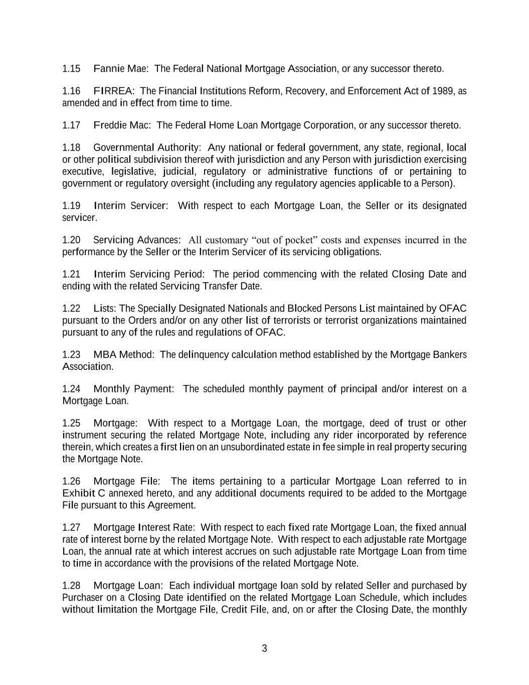 3 1.15 Fannie Mae: The Federal National Mortgage Association, or any successor thereto. 1.16 FIRREA: The Financial Institutions Reform, Recovery, and Enforcement Act of 1989, as amended and in effect from time to time. 1.17 Freddie Mac: The Federal Home Loan Mortgage Corporation, or any successor thereto. 1.18 Governmental Authority: Any national or federal government, any state, regional, local or other political subdivision thereof with jurisdiction and any Person with jurisdiction exercising executive, legislative, judicial, regulatory or administrative functions of or pertaining to government or regulatory oversight (including any regulatory agencies applicable to a Person). 1.19 Interim Servicer: With respect to each Mortgage Loan, the Seller or its designated servicer. 1.20 Servicing Advances: All customary “out of pocket” costs and expenses incurred in the performance by the Seller or the Interim Servicer of its servicing obligations. 1.21 Interim Servicing Period: The period commencing with the related Closing Date and ending with the related Servicing Transfer Date. 1.22 Lists: The Specially Designated Nationals and Blocked Persons List maintained by OFAC pursuant to the Orders and/or on any other list of terrorists or terrorist organizations maintained pursuant to any of the rules and regulations of OFAC. 1.23 MBA Method: The delinquency calculation method established by the Mortgage Bankers Association. 1.24 Monthly Payment: The scheduled monthly payment of principal and/or interest on a Mortgage Loan. 1.25 Mortgage: With respect to a Mortgage Loan, the mortgage, deed of trust or other instrument securing the related Mortgage Note, including any rider incorporated by reference therein, which creates a first lien on an unsubordinated estate in fee simple in real property securing the Mortgage Note. 1.26 Mortgage File: The items pertaining to a particular Mortgage Loan referred to in Exhibit C annexed hereto, and any additional documents required to be added to the Mortgage File pursuant to this Agreement. 1.27 Mortgage Interest Rate: With respect to each fixed rate Mortgage Loan, the fixed annual rate of interest borne by the related Mortgage Note. With respect to each adjustable rate Mortgage Loan, the annual rate at which interest accrues on such adjustable rate Mortgage Loan from time to time in accordance with the provisions of the related Mortgage Note. 1.28 Mortgage Loan: Each individual mortgage loan sold by related Seller and purchased by Purchaser on a Closing Date identified on the related Mortgage Loan Schedule, which includes without limitation the Mortgage File, Credit File, and, on or after the Closing Date, the monthly