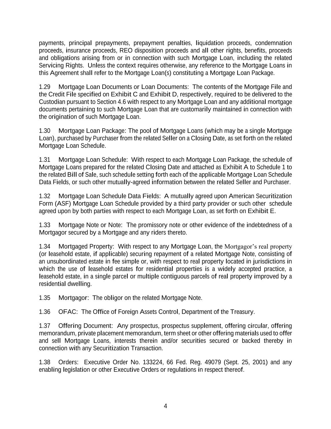 4 payments, principal prepayments, prepayment penalties, liquidation proceeds, condemnation proceeds, insurance proceeds, REO disposition proceeds and all other rights, benefits, proceeds and obligations arising from or in connection with such Mortgage Loan, including the related Servicing Rights. Unless the context requires otherwise, any reference to the Mortgage Loans in this Agreement shall refer to the Mortgage Loan(s) constituting a Mortgage Loan Package. 1.29 Mortgage Loan Documents or Loan Documents: The contents of the Mortgage File and the Credit File specified on Exhibit C and Exhibit D, respectively, required to be delivered to the Custodian pursuant to Section 4.6 with respect to any Mortgage Loan and any additional mortgage documents pertaining to such Mortgage Loan that are customarily maintained in connection with the origination of such Mortgage Loan. 1.30 Mortgage Loan Package: The pool of Mortgage Loans (which may be a single Mortgage Loan), purchased by Purchaser from the related Seller on a Closing Date, as set forth on the related Mortgage Loan Schedule. 1.31 Mortgage Loan Schedule: With respect to each Mortgage Loan Package, the schedule of Mortgage Loans prepared for the related Closing Date and attached as Exhibit A to Schedule 1 to the related Bill of Sale, such schedule setting forth each of the applicable Mortgage Loan Schedule Data Fields, or such other mutually-agreed information between the related Seller and Purchaser. 1.32 Mortgage Loan Schedule Data Fields: A mutually agreed upon American Securitization Form (ASF) Mortgage Loan Schedule provided by a third party provider or such other schedule agreed upon by both parties with respect to each Mortgage Loan, as set forth on Exhibit E. 1.33 Mortgage Note or Note: The promissory note or other evidence of the indebtedness of a Mortgagor secured by a Mortgage and any riders thereto. 1.34 Mortgaged Property: With respect to any Mortgage Loan, the Mortgagor’s real property (or leasehold estate, if applicable) securing repayment of a related Mortgage Note, consisting of an unsubordinated estate in fee simple or, with respect to real property located in jurisdictions in which the use of leasehold estates for residential properties is a widely accepted practice, a leasehold estate, in a single parcel or multiple contiguous parcels of real property improved by a residential dwelling. 1.35 Mortgagor: The obligor on the related Mortgage Note. 1.36 OFAC: The Office of Foreign Assets Control, Department of the Treasury. 1.37 Offering Document: Any prospectus, prospectus supplement, offering circular, offering memorandum, private placement memorandum, term sheet or other offering materials used to offer and sell Mortgage Loans, interests therein and/or securities secured or backed thereby in connection with any Securitization Transaction. 1.38 Orders: Executive Order No. 133224, 66 Fed. Reg. 49079 (Sept. 25, 2001) and any enabling legislation or other Executive Orders or regulations in respect thereof.