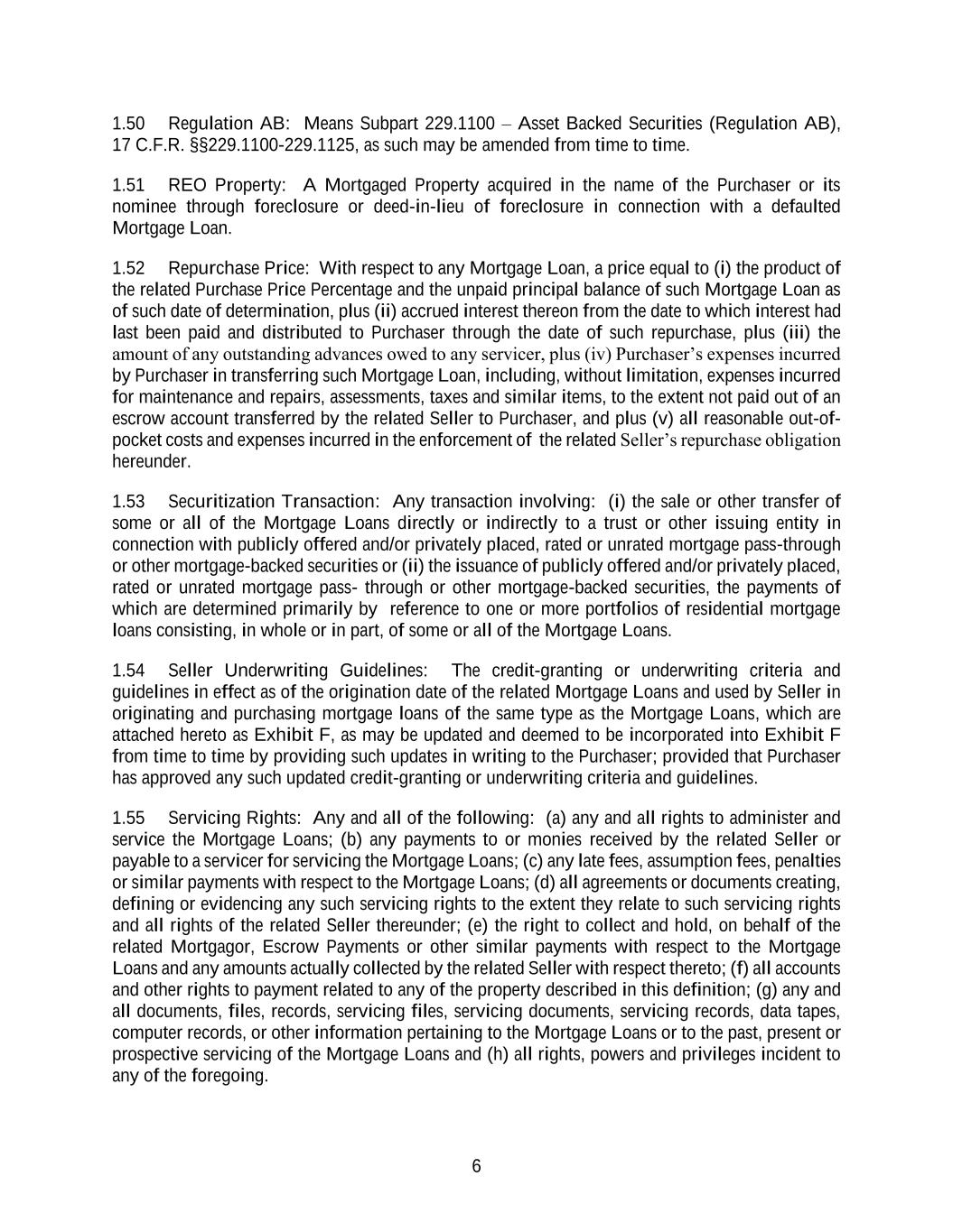 6 1.50 Regulation AB: Means Subpart 229.1100 – Asset Backed Securities (Regulation AB), 17 C.F.R. §§229.1100-229.1125, as such may be amended from time to time. 1.51 REO Property: A Mortgaged Property acquired in the name of the Purchaser or its nominee through foreclosure or deed-in-lieu of foreclosure in connection with a defaulted Mortgage Loan. 1.52 Repurchase Price: With respect to any Mortgage Loan, a price equal to (i) the product of the related Purchase Price Percentage and the unpaid principal balance of such Mortgage Loan as of such date of determination, plus (ii) accrued interest thereon from the date to which interest had last been paid and distributed to Purchaser through the date of such repurchase, plus (iii) the amount of any outstanding advances owed to any servicer, plus (iv) Purchaser’s expenses incurred by Purchaser in transferring such Mortgage Loan, including, without limitation, expenses incurred for maintenance and repairs, assessments, taxes and similar items, to the extent not paid out of an escrow account transferred by the related Seller to Purchaser, and plus (v) all reasonable out-of- pocket costs and expenses incurred in the enforcement of the related Seller’s repurchase obligation hereunder. 1.53 Securitization Transaction: Any transaction involving: (i) the sale or other transfer of some or all of the Mortgage Loans directly or indirectly to a trust or other issuing entity in connection with publicly offered and/or privately placed, rated or unrated mortgage pass-through or other mortgage-backed securities or (ii) the issuance of publicly offered and/or privately placed, rated or unrated mortgage pass- through or other mortgage-backed securities, the payments of which are determined primarily by reference to one or more portfolios of residential mortgage loans consisting, in whole or in part, of some or all of the Mortgage Loans. 1.54 Seller Underwriting Guidelines: The credit-granting or underwriting criteria and guidelines in effect as of the origination date of the related Mortgage Loans and used by Seller in originating and purchasing mortgage loans of the same type as the Mortgage Loans, which are attached hereto as Exhibit F, as may be updated and deemed to be incorporated into Exhibit F from time to time by providing such updates in writing to the Purchaser; provided that Purchaser has approved any such updated credit-granting or underwriting criteria and guidelines. 1.55 Servicing Rights: Any and all of the following: (a) any and all rights to administer and service the Mortgage Loans; (b) any payments to or monies received by the related Seller or payable to a servicer for servicing the Mortgage Loans; (c) any late fees, assumption fees, penalties or similar payments with respect to the Mortgage Loans; (d) all agreements or documents creating, defining or evidencing any such servicing rights to the extent they relate to such servicing rights and all rights of the related Seller thereunder; (e) the right to collect and hold, on behalf of the related Mortgagor, Escrow Payments or other similar payments with respect to the Mortgage Loans and any amounts actually collected by the related Seller with respect thereto; (f) all accounts and other rights to payment related to any of the property described in this definition; (g) any and all documents, files, records, servicing files, servicing documents, servicing records, data tapes, computer records, or other information pertaining to the Mortgage Loans or to the past, present or prospective servicing of the Mortgage Loans and (h) all rights, powers and privileges incident to any of the foregoing.