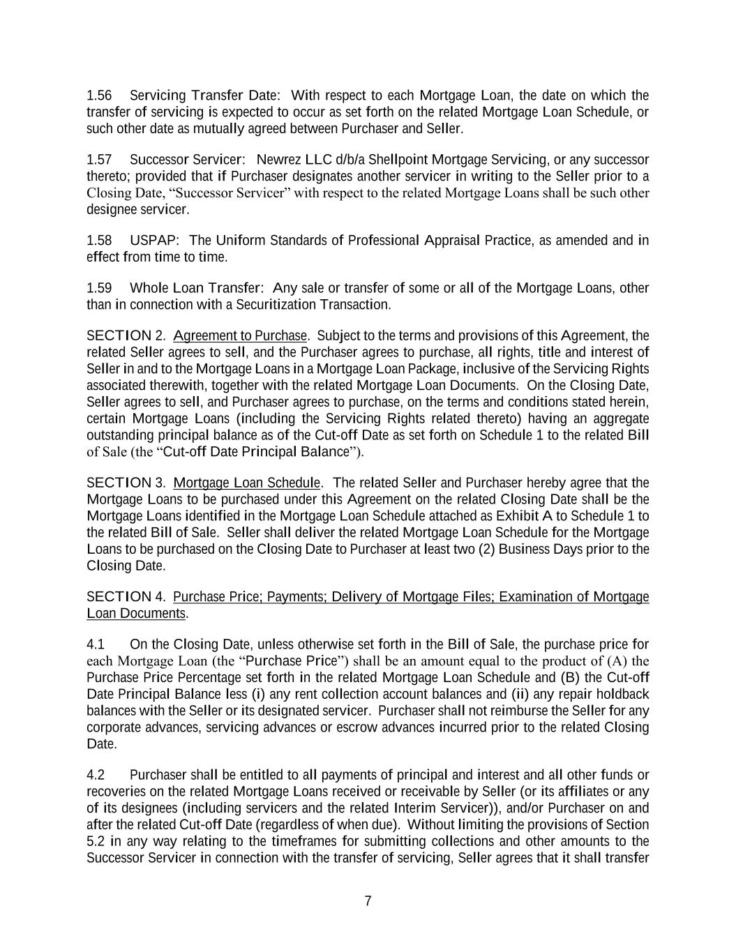 7 1.56 Servicing Transfer Date: With respect to each Mortgage Loan, the date on which the transfer of servicing is expected to occur as set forth on the related Mortgage Loan Schedule, or such other date as mutually agreed between Purchaser and Seller. 1.57 Successor Servicer: Newrez LLC d/b/a Shellpoint Mortgage Servicing, or any successor thereto; provided that if Purchaser designates another servicer in writing to the Seller prior to a Closing Date, “Successor Servicer” with respect to the related Mortgage Loans shall be such other designee servicer. 1.58 USPAP: The Uniform Standards of Professional Appraisal Practice, as amended and in effect from time to time. 1.59 Whole Loan Transfer: Any sale or transfer of some or all of the Mortgage Loans, other than in connection with a Securitization Transaction. SECTION 2. Agreement to Purchase. Subject to the terms and provisions of this Agreement, the related Seller agrees to sell, and the Purchaser agrees to purchase, all rights, title and interest of Seller in and to the Mortgage Loans in a Mortgage Loan Package, inclusive of the Servicing Rights associated therewith, together with the related Mortgage Loan Documents. On the Closing Date, Seller agrees to sell, and Purchaser agrees to purchase, on the terms and conditions stated herein, certain Mortgage Loans (including the Servicing Rights related thereto) having an aggregate outstanding principal balance as of the Cut-off Date as set forth on Schedule 1 to the related Bill of Sale (the “Cut-off Date Principal Balance”). SECTION 3. Mortgage Loan Schedule. The related Seller and Purchaser hereby agree that the Mortgage Loans to be purchased under this Agreement on the related Closing Date shall be the Mortgage Loans identified in the Mortgage Loan Schedule attached as Exhibit A to Schedule 1 to the related Bill of Sale. Seller shall deliver the related Mortgage Loan Schedule for the Mortgage Loans to be purchased on the Closing Date to Purchaser at least two (2) Business Days prior to the Closing Date. SECTION 4. Purchase Price; Payments; Delivery of Mortgage Files; Examination of Mortgage Loan Documents. 4.1 On the Closing Date, unless otherwise set forth in the Bill of Sale, the purchase price for each Mortgage Loan (the “Purchase Price”) shall be an amount equal to the product of (A) the Purchase Price Percentage set forth in the related Mortgage Loan Schedule and (B) the Cut-off Date Principal Balance less (i) any rent collection account balances and (ii) any repair holdback balances with the Seller or its designated servicer. Purchaser shall not reimburse the Seller for any corporate advances, servicing advances or escrow advances incurred prior to the related Closing Date. 4.2 Purchaser shall be entitled to all payments of principal and interest and all other funds or recoveries on the related Mortgage Loans received or receivable by Seller (or its affiliates or any of its designees (including servicers and the related Interim Servicer)), and/or Purchaser on and after the related Cut-off Date (regardless of when due). Without limiting the provisions of Section 5.2 in any way relating to the timeframes for submitting collections and other amounts to the Successor Servicer in connection with the transfer of servicing, Seller agrees that it shall transfer