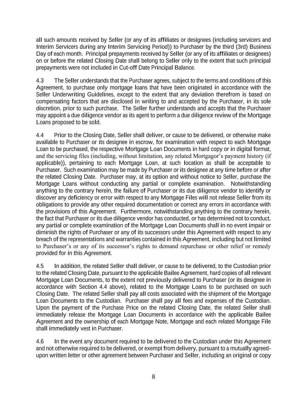 8 all such amounts received by Seller (or any of its affiliates or designees (including servicers and Interim Servicers during any Interim Servicing Period)) to Purchaser by the third (3rd) Business Day of each month. Principal prepayments received by Seller (or any of its affiliates or designees) on or before the related Closing Date shall belong to Seller only to the extent that such principal prepayments were not included in Cut-off Date Principal Balance. 4.3 The Seller understands that the Purchaser agrees, subject to the terms and conditions of this Agreement, to purchase only mortgage loans that have been originated in accordance with the Seller Underwriting Guidelines, except to the extent that any deviation therefrom is based on compensating factors that are disclosed in writing to and accepted by the Purchaser, in its sole discretion, prior to such purchase. The Seller further understands and accepts that the Purchaser may appoint a due diligence vendor as its agent to perform a due diligence review of the Mortgage Loans proposed to be sold. 4.4 Prior to the Closing Date, Seller shall deliver, or cause to be delivered, or otherwise make available to Purchaser or its designee in escrow, for examination with respect to each Mortgage Loan to be purchased, the respective Mortgage Loan Documents in hard copy or in digital format, and the servicing files (including, without limitation, any related Mortgagor’s payment history (if applicable)), pertaining to each Mortgage Loan, at such location as shall be acceptable to Purchaser. Such examination may be made by Purchaser or its designee at any time before or after the related Closing Date. Purchaser may, at its option and without notice to Seller, purchase the Mortgage Loans without conducting any partial or complete examination. Notwithstanding anything to the contrary herein, the failure of Purchaser or its due diligence vendor to identify or discover any deficiency or error with respect to any Mortgage Files will not release Seller from its obligations to provide any other required documentation or correct any errors in accordance with the provisions of this Agreement. Furthermore, notwithstanding anything to the contrary herein, the fact that Purchaser or its due diligence vendor has conducted, or has determined not to conduct, any partial or complete examination of the Mortgage Loan Documents shall in no event impair or diminish the rights of Purchaser or any of its successors under this Agreement with respect to any breach of the representations and warranties contained in this Agreement, including but not limited to Purchaser’s or any of its successor’s rights to demand repurchase or other relief or remedy provided for in this Agreement. 4.5 In addition, the related Seller shall deliver, or cause to be delivered, to the Custodian prior to the related Closing Date, pursuant to the applicable Bailee Agreement, hard copies of all relevant Mortgage Loan Documents, to the extent not previously delivered to Purchaser (or its designee in accordance with Section 4.4 above), related to the Mortgage Loans to be purchased on such Closing Date. The related Seller shall pay all costs associated with the shipment of the Mortgage Loan Documents to the Custodian. Purchaser shall pay all fees and expenses of the Custodian. Upon the payment of the Purchase Price on the related Closing Date, the related Seller shall immediately release the Mortgage Loan Documents in accordance with the applicable Bailee Agreement and the ownership of each Mortgage Note, Mortgage and each related Mortgage File shall immediately vest in Purchaser. 4.6 In the event any document required to be delivered to the Custodian under this Agreement and not otherwise required to be delivered, or exempt from delivery, pursuant to a mutually agreed- upon written letter or other agreement between Purchaser and Seller, including an original or copy