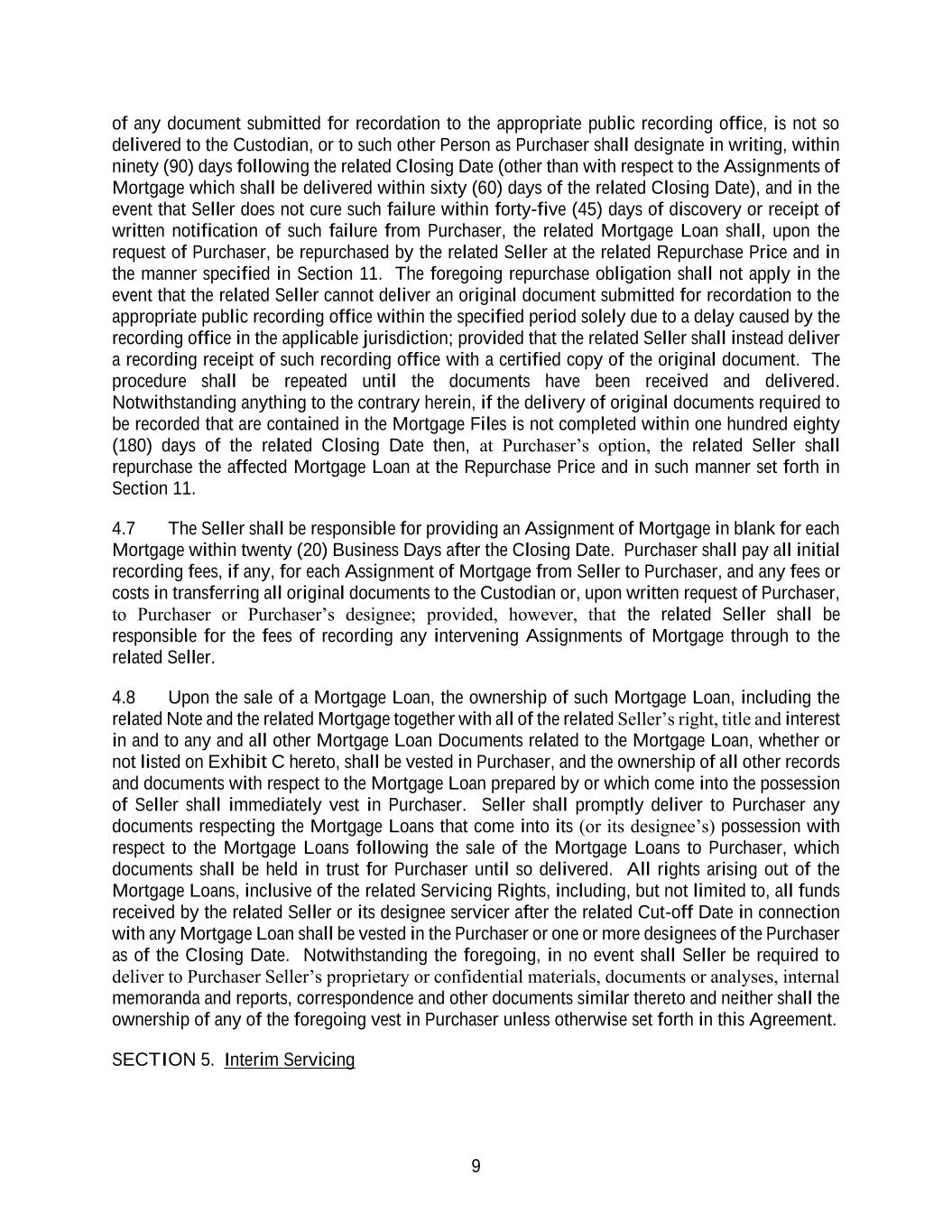 9 of any document submitted for recordation to the appropriate public recording office, is not so delivered to the Custodian, or to such other Person as Purchaser shall designate in writing, within ninety (90) days following the related Closing Date (other than with respect to the Assignments of Mortgage which shall be delivered within sixty (60) days of the related Closing Date), and in the event that Seller does not cure such failure within forty-five (45) days of discovery or receipt of written notification of such failure from Purchaser, the related Mortgage Loan shall, upon the request of Purchaser, be repurchased by the related Seller at the related Repurchase Price and in the manner specified in Section 11. The foregoing repurchase obligation shall not apply in the event that the related Seller cannot deliver an original document submitted for recordation to the appropriate public recording office within the specified period solely due to a delay caused by the recording office in the applicable jurisdiction; provided that the related Seller shall instead deliver a recording receipt of such recording office with a certified copy of the original document. The procedure shall be repeated until the documents have been received and delivered. Notwithstanding anything to the contrary herein, if the delivery of original documents required to be recorded that are contained in the Mortgage Files is not completed within one hundred eighty (180) days of the related Closing Date then, at Purchaser’s option, the related Seller shall repurchase the affected Mortgage Loan at the Repurchase Price and in such manner set forth in Section 11. 4.7 The Seller shall be responsible for providing an Assignment of Mortgage in blank for each Mortgage within twenty (20) Business Days after the Closing Date. Purchaser shall pay all initial recording fees, if any, for each Assignment of Mortgage from Seller to Purchaser, and any fees or costs in transferring all original documents to the Custodian or, upon written request of Purchaser, to Purchaser or Purchaser’s designee; provided, however, that the related Seller shall be responsible for the fees of recording any intervening Assignments of Mortgage through to the related Seller. 4.8 Upon the sale of a Mortgage Loan, the ownership of such Mortgage Loan, including the related Note and the related Mortgage together with all of the related Seller’s right, title and interest in and to any and all other Mortgage Loan Documents related to the Mortgage Loan, whether or not listed on Exhibit C hereto, shall be vested in Purchaser, and the ownership of all other records and documents with respect to the Mortgage Loan prepared by or which come into the possession of Seller shall immediately vest in Purchaser. Seller shall promptly deliver to Purchaser any documents respecting the Mortgage Loans that come into its (or its designee’s) possession with respect to the Mortgage Loans following the sale of the Mortgage Loans to Purchaser, which documents shall be held in trust for Purchaser until so delivered. All rights arising out of the Mortgage Loans, inclusive of the related Servicing Rights, including, but not limited to, all funds received by the related Seller or its designee servicer after the related Cut-off Date in connection with any Mortgage Loan shall be vested in the Purchaser or one or more designees of the Purchaser as of the Closing Date. Notwithstanding the foregoing, in no event shall Seller be required to deliver to Purchaser Seller’s proprietary or confidential materials, documents or analyses, internal memoranda and reports, correspondence and other documents similar thereto and neither shall the ownership of any of the foregoing vest in Purchaser unless otherwise set forth in this Agreement. SECTION 5. Interim Servicing