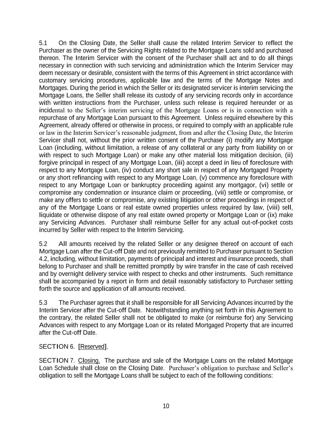 10 5.1 On the Closing Date, the Seller shall cause the related Interim Servicer to reflect the Purchaser as the owner of the Servicing Rights related to the Mortgage Loans sold and purchased thereon. The Interim Servicer with the consent of the Purchaser shall act and to do all things necessary in connection with such servicing and administration which the Interim Servicer may deem necessary or desirable, consistent with the terms of this Agreement in strict accordance with customary servicing procedures, applicable law and the terms of the Mortgage Notes and Mortgages. During the period in which the Seller or its designated servicer is interim servicing the Mortgage Loans, the Seller shall release its custody of any servicing records only in accordance with written instructions from the Purchaser, unless such release is required hereunder or as incidental to the Seller’s interim servicing of the Mortgage Loans or is in connection with a repurchase of any Mortgage Loan pursuant to this Agreement. Unless required elsewhere by this Agreement, already offered or otherwise in process, or required to comply with an applicable rule or law in the Interim Servicer’s reasonable judgment, from and after the Closing Date, the Interim Servicer shall not, without the prior written consent of the Purchaser (i) modify any Mortgage Loan (including, without limitation, a release of any collateral or any party from liability on or with respect to such Mortgage Loan) or make any other material loss mitigation decision, (ii) forgive principal in respect of any Mortgage Loan, (iii) accept a deed in lieu of foreclosure with respect to any Mortgage Loan, (iv) conduct any short sale in respect of any Mortgaged Property or any short refinancing with respect to any Mortgage Loan, (v) commence any foreclosure with respect to any Mortgage Loan or bankruptcy proceeding against any mortgagor, (vi) settle or compromise any condemnation or insurance claim or proceeding, (vii) settle or compromise, or make any offers to settle or compromise, any existing litigation or other proceedings in respect of any of the Mortgage Loans or real estate owned properties unless required by law, (viii) sell, liquidate or otherwise dispose of any real estate owned property or Mortgage Loan or (ix) make any Servicing Advances. Purchaser shall reimburse Seller for any actual out-of-pocket costs incurred by Seller with respect to the Interim Servicing. 5.2 All amounts received by the related Seller or any designee thereof on account of each Mortgage Loan after the Cut-off Date and not previously remitted to Purchaser pursuant to Section 4.2, including, without limitation, payments of principal and interest and insurance proceeds, shall belong to Purchaser and shall be remitted promptly by wire transfer in the case of cash received and by overnight delivery service with respect to checks and other instruments. Such remittance shall be accompanied by a report in form and detail reasonably satisfactory to Purchaser setting forth the source and application of all amounts received. 5.3 The Purchaser agrees that it shall be responsible for all Servicing Advances incurred by the Interim Servicer after the Cut-off Date. Notwithstanding anything set forth in this Agreement to the contrary, the related Seller shall not be obligated to make (or reimburse for) any Servicing Advances with respect to any Mortgage Loan or its related Mortgaged Property that are incurred after the Cut-off Date. SECTION 6. [Reserved]. SECTION 7. Closing. The purchase and sale of the Mortgage Loans on the related Mortgage Loan Schedule shall close on the Closing Date. Purchaser’s obligation to purchase and Seller’s obligation to sell the Mortgage Loans shall be subject to each of the following conditions: