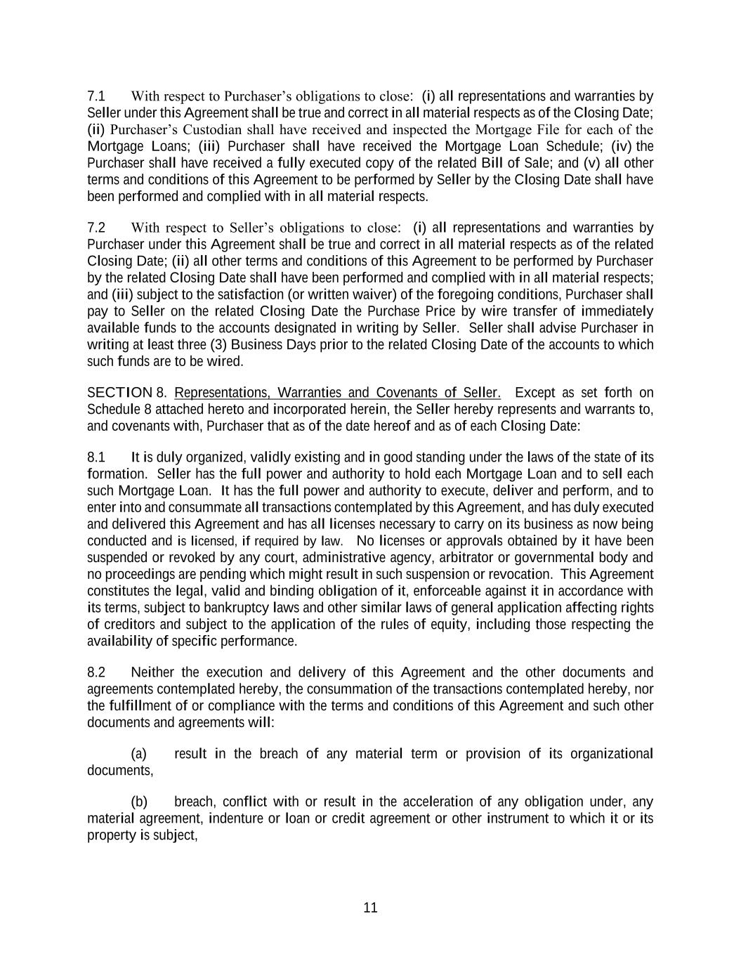 11 7.1 With respect to Purchaser’s obligations to close: (i) all representations and warranties by Seller under this Agreement shall be true and correct in all material respects as of the Closing Date; (ii) Purchaser’s Custodian shall have received and inspected the Mortgage File for each of the Mortgage Loans; (iii) Purchaser shall have received the Mortgage Loan Schedule; (iv) the Purchaser shall have received a fully executed copy of the related Bill of Sale; and (v) all other terms and conditions of this Agreement to be performed by Seller by the Closing Date shall have been performed and complied with in all material respects. 7.2 With respect to Seller’s obligations to close: (i) all representations and warranties by Purchaser under this Agreement shall be true and correct in all material respects as of the related Closing Date; (ii) all other terms and conditions of this Agreement to be performed by Purchaser by the related Closing Date shall have been performed and complied with in all material respects; and (iii) subject to the satisfaction (or written waiver) of the foregoing conditions, Purchaser shall pay to Seller on the related Closing Date the Purchase Price by wire transfer of immediately available funds to the accounts designated in writing by Seller. Seller shall advise Purchaser in writing at least three (3) Business Days prior to the related Closing Date of the accounts to which such funds are to be wired. SECTION 8. Representations, Warranties and Covenants of Seller. Except as set forth on Schedule 8 attached hereto and incorporated herein, the Seller hereby represents and warrants to, and covenants with, Purchaser that as of the date hereof and as of each Closing Date: 8.1 It is duly organized, validly existing and in good standing under the laws of the state of its formation. Seller has the full power and authority to hold each Mortgage Loan and to sell each such Mortgage Loan. It has the full power and authority to execute, deliver and perform, and to enter into and consummate all transactions contemplated by this Agreement, and has duly executed and delivered this Agreement and has all licenses necessary to carry on its business as now being conducted and is licensed, if required by law. No licenses or approvals obtained by it have been suspended or revoked by any court, administrative agency, arbitrator or governmental body and no proceedings are pending which might result in such suspension or revocation. This Agreement constitutes the legal, valid and binding obligation of it, enforceable against it in accordance with its terms, subject to bankruptcy laws and other similar laws of general application affecting rights of creditors and subject to the application of the rules of equity, including those respecting the availability of specific performance. 8.2 Neither the execution and delivery of this Agreement and the other documents and agreements contemplated hereby, the consummation of the transactions contemplated hereby, nor the fulfillment of or compliance with the terms and conditions of this Agreement and such other documents and agreements will: (a) result in the breach of any material term or provision of its organizational documents, (b) breach, conflict with or result in the acceleration of any obligation under, any material agreement, indenture or loan or credit agreement or other instrument to which it or its property is subject,
