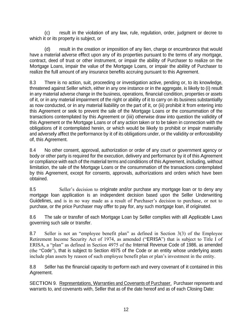 12 (c) result in the violation of any law, rule, regulation, order, judgment or decree to which it or its property is subject, or (d) result in the creation or imposition of any lien, charge or encumbrance that would have a material adverse effect upon any of its properties pursuant to the terms of any mortgage, contract, deed of trust or other instrument, or impair the ability of Purchaser to realize on the Mortgage Loans, impair the value of the Mortgage Loans, or impair the ability of Purchaser to realize the full amount of any insurance benefits accruing pursuant to this Agreement. 8.3 There is no action, suit, proceeding or investigation active, pending or, to its knowledge, threatened against Seller which, either in any one instance or in the aggregate, is likely to (i) result in any material adverse change in the business, operations, financial condition, properties or assets of it, or in any material impairment of the right or ability of it to carry on its business substantially as now conducted, or in any material liability on the part of it, or (ii) prohibit it from entering into this Agreement or seek to prevent the sale of the Mortgage Loans or the consummation of the transactions contemplated by this Agreement or (iii) otherwise draw into question the validity of this Agreement or the Mortgage Loans or of any action taken or to be taken in connection with the obligations of it contemplated herein, or which would be likely to prohibit or impair materially and adversely affect the performance by it of its obligations under, or the validity or enforceability of, this Agreement. 8.4 No other consent, approval, authorization or order of any court or government agency or body or other party is required for the execution, delivery and performance by it of this Agreement or compliance with each of the material terms and conditions of this Agreement, including, without limitation, the sale of the Mortgage Loans or the consummation of the transactions contemplated by this Agreement, except for consents, approvals, authorizations and orders which have been obtained. 8.5 Seller’s decision to originate and/or purchase any mortgage loan or to deny any mortgage loan application is an independent decision based upon the Seller Underwriting Guidelines, and is in no way made as a result of Purchaser’s decision to purchase, or not to purchase, or the price Purchaser may offer to pay for, any such mortgage loan, if originated. 8.6 The sale or transfer of each Mortgage Loan by Seller complies with all Applicable Laws governing such sale or transfer. 8.7 Seller is not an “employee benefit plan” as defined in Section 3(3) of the Employee Retirement Income Security Act of 1974, as amended (“ERISA”) that is subject to Title I of ERISA, a “plan” as defined in Section 4975 of the Internal Revenue Code of 1986, as amended (the “Code”), that is subject to Section 4975 of the Code or an entity whose underlying assets include plan assets by reason of such employee benefit plan or plan’s investment in the entity. 8.8 Seller has the financial capacity to perform each and every covenant of it contained in this Agreement. SECTION 9. Representations, Warranties and Covenants of Purchaser. Purchaser represents and warrants to, and covenants with, Seller that as of the date hereof and as of each Closing Date: