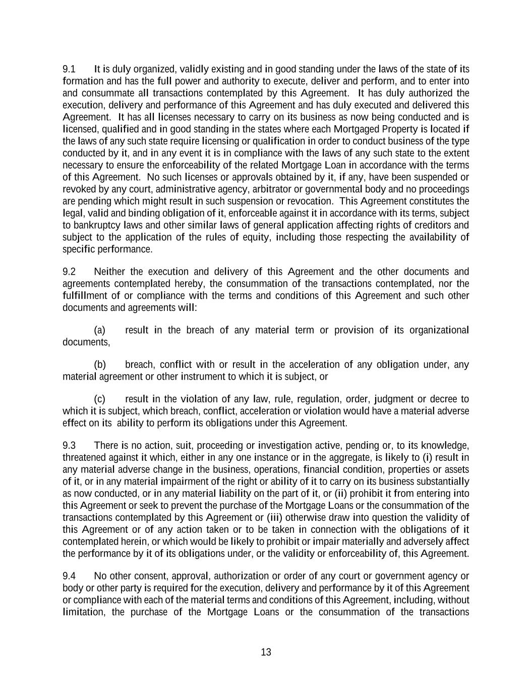13 9.1 It is duly organized, validly existing and in good standing under the laws of the state of its formation and has the full power and authority to execute, deliver and perform, and to enter into and consummate all transactions contemplated by this Agreement. It has duly authorized the execution, delivery and performance of this Agreement and has duly executed and delivered this Agreement. It has all licenses necessary to carry on its business as now being conducted and is licensed, qualified and in good standing in the states where each Mortgaged Property is located if the laws of any such state require licensing or qualification in order to conduct business of the type conducted by it, and in any event it is in compliance with the laws of any such state to the extent necessary to ensure the enforceability of the related Mortgage Loan in accordance with the terms of this Agreement. No such licenses or approvals obtained by it, if any, have been suspended or revoked by any court, administrative agency, arbitrator or governmental body and no proceedings are pending which might result in such suspension or revocation. This Agreement constitutes the legal, valid and binding obligation of it, enforceable against it in accordance with its terms, subject to bankruptcy laws and other similar laws of general application affecting rights of creditors and subject to the application of the rules of equity, including those respecting the availability of specific performance. 9.2 Neither the execution and delivery of this Agreement and the other documents and agreements contemplated hereby, the consummation of the transactions contemplated, nor the fulfillment of or compliance with the terms and conditions of this Agreement and such other documents and agreements will: (a) result in the breach of any material term or provision of its organizational documents, (b) breach, conflict with or result in the acceleration of any obligation under, any material agreement or other instrument to which it is subject, or (c) result in the violation of any law, rule, regulation, order, judgment or decree to which it is subject, which breach, conflict, acceleration or violation would have a material adverse effect on its ability to perform its obligations under this Agreement. 9.3 There is no action, suit, proceeding or investigation active, pending or, to its knowledge, threatened against it which, either in any one instance or in the aggregate, is likely to (i) result in any material adverse change in the business, operations, financial condition, properties or assets of it, or in any material impairment of the right or ability of it to carry on its business substantially as now conducted, or in any material liability on the part of it, or (ii) prohibit it from entering into this Agreement or seek to prevent the purchase of the Mortgage Loans or the consummation of the transactions contemplated by this Agreement or (iii) otherwise draw into question the validity of this Agreement or of any action taken or to be taken in connection with the obligations of it contemplated herein, or which would be likely to prohibit or impair materially and adversely affect the performance by it of its obligations under, or the validity or enforceability of, this Agreement. 9.4 No other consent, approval, authorization or order of any court or government agency or body or other party is required for the execution, delivery and performance by it of this Agreement or compliance with each of the material terms and conditions of this Agreement, including, without limitation, the purchase of the Mortgage Loans or the consummation of the transactions
