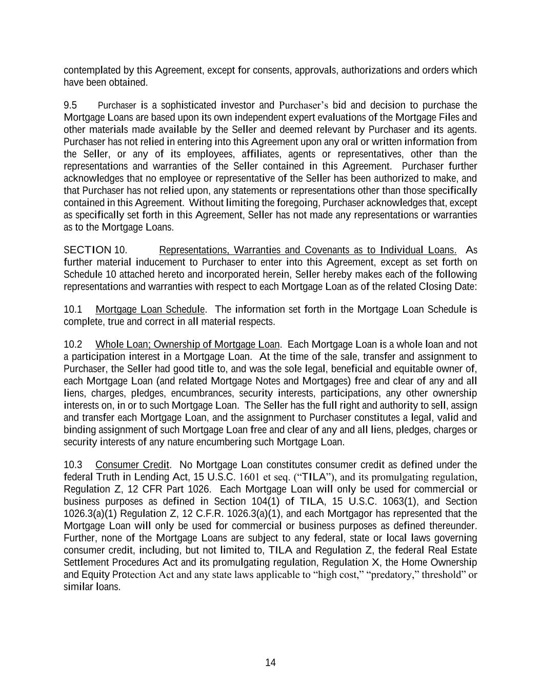 14 contemplated by this Agreement, except for consents, approvals, authorizations and orders which have been obtained. 9.5 Purchaser is a sophisticated investor and Purchaser’s bid and decision to purchase the Mortgage Loans are based upon its own independent expert evaluations of the Mortgage Files and other materials made available by the Seller and deemed relevant by Purchaser and its agents. Purchaser has not relied in entering into this Agreement upon any oral or written information from the Seller, or any of its employees, affiliates, agents or representatives, other than the representations and warranties of the Seller contained in this Agreement. Purchaser further acknowledges that no employee or representative of the Seller has been authorized to make, and that Purchaser has not relied upon, any statements or representations other than those specifically contained in this Agreement. Without limiting the foregoing, Purchaser acknowledges that, except as specifically set forth in this Agreement, Seller has not made any representations or warranties as to the Mortgage Loans. SECTION 10. Representations, Warranties and Covenants as to Individual Loans. As further material inducement to Purchaser to enter into this Agreement, except as set forth on Schedule 10 attached hereto and incorporated herein, Seller hereby makes each of the following representations and warranties with respect to each Mortgage Loan as of the related Closing Date: 10.1 Mortgage Loan Schedule. The information set forth in the Mortgage Loan Schedule is complete, true and correct in all material respects. 10.2 Whole Loan; Ownership of Mortgage Loan. Each Mortgage Loan is a whole loan and not a participation interest in a Mortgage Loan. At the time of the sale, transfer and assignment to Purchaser, the Seller had good title to, and was the sole legal, beneficial and equitable owner of, each Mortgage Loan (and related Mortgage Notes and Mortgages) free and clear of any and all liens, charges, pledges, encumbrances, security interests, participations, any other ownership interests on, in or to such Mortgage Loan. The Seller has the full right and authority to sell, assign and transfer each Mortgage Loan, and the assignment to Purchaser constitutes a legal, valid and binding assignment of such Mortgage Loan free and clear of any and all liens, pledges, charges or security interests of any nature encumbering such Mortgage Loan. 10.3 Consumer Credit. No Mortgage Loan constitutes consumer credit as defined under the federal Truth in Lending Act, 15 U.S.C. 1601 et seq. (“TILA”), and its promulgating regulation, Regulation Z, 12 CFR Part 1026. Each Mortgage Loan will only be used for commercial or business purposes as defined in Section 104(1) of TILA, 15 U.S.C. 1063(1), and Section 1026.3(a)(1) Regulation Z, 12 C.F.R. 1026.3(a)(1), and each Mortgagor has represented that the Mortgage Loan will only be used for commercial or business purposes as defined thereunder. Further, none of the Mortgage Loans are subject to any federal, state or local laws governing consumer credit, including, but not limited to, TILA and Regulation Z, the federal Real Estate Settlement Procedures Act and its promulgating regulation, Regulation X, the Home Ownership and Equity Protection Act and any state laws applicable to “high cost,” “predatory,” threshold” or similar loans.