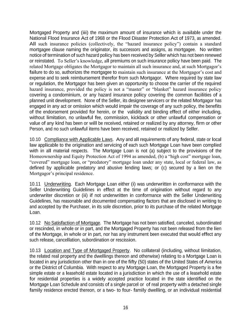 16 Mortgaged Property and (iii) the maximum amount of insurance which is available under the National Flood Insurance Act of 1968 or the Flood Disaster Protection Act of 1973, as amended. All such insurance policies (collectively, the “hazard insurance policy”) contain a standard mortgagee clause naming the originator, its successors and assigns, as mortgagee. No written notice of termination of such hazard policy has been received by Seller which has not been renewed or reinstated. To Seller’s knowledge, all premiums on such insurance policy have been paid. The related Mortgage obligates the Mortgagor to maintain all such insurance and, at such Mortgagor’s failure to do so, authorizes the mortgagee to maintain such insurance at the Mortgagor’s cost and expense and to seek reimbursement therefor from such Mortgagor. Where required by state law or regulation, the Mortgagor has been given an opportunity to choose the carrier of the required hazard insurance, provided the policy is not a “master” or “blanket” hazard insurance policy covering a condominium, or any hazard insurance policy covering the common facilities of a planned unit development. None of the Seller, its designee servicers or the related Mortgagor has engaged in any act or omission which would impair the coverage of any such policy, the benefits of the endorsement provided for herein, or the validity and binding effect of either including, without limitation, no unlawful fee, commission, kickback or other unlawful compensation or value of any kind has been or will be received, retained or realized by any attorney, firm or other Person, and no such unlawful items have been received, retained or realized by Seller. 10.10 Compliance with Applicable Laws. Any and all requirements of any federal, state or local law applicable to the origination and servicing of each such Mortgage Loan have been complied with in all material respects. The Mortgage Loan is not (a) subject to the provisions of the Homeownership and Equity Protection Act of 1994 as amended, (b) a “high cost” mortgage loan, “covered” mortgage loan, or “predatory” mortgage loan under any state, local or federal law, as defined by applicable predatory and abusive lending laws; or (c) secured by a lien on the Mortgagor’s principal residence. 10.11 Underwriting. Each Mortgage Loan either (i) was underwritten in conformance with the Seller Underwriting Guidelines in effect at the time of origination without regard to any underwriter discretion or (ii) if not underwritten in conformance with the Seller Underwriting Guidelines, has reasonable and documented compensating factors that are disclosed in writing to and accepted by the Purchaser, in its sole discretion, prior to its purchase of the related Mortgage Loan. 10.12 No Satisfaction of Mortgage. The Mortgage has not been satisfied, canceled, subordinated or rescinded, in whole or in part, and the Mortgaged Property has not been released from the lien of the Mortgage, in whole or in part, nor has any instrument been executed that would effect any such release, cancellation, subordination or rescission. 10.13 Location and Type of Mortgaged Property. No collateral (including, without limitation, the related real property and the dwellings thereon and otherwise) relating to a Mortgage Loan is located in any jurisdiction other than in one of the fifty (50) states of the United States of America or the District of Columbia. With respect to any Mortgage Loan, the Mortgaged Property is a fee simple estate or a leasehold estate located in a jurisdiction in which the use of a leasehold estate for residential properties is a widely accepted practice located in the state identified on the Mortgage Loan Schedule and consists of a single parcel or of real property with a detached single family residence erected thereon, or a two- to four- family dwelling, or an individual residential