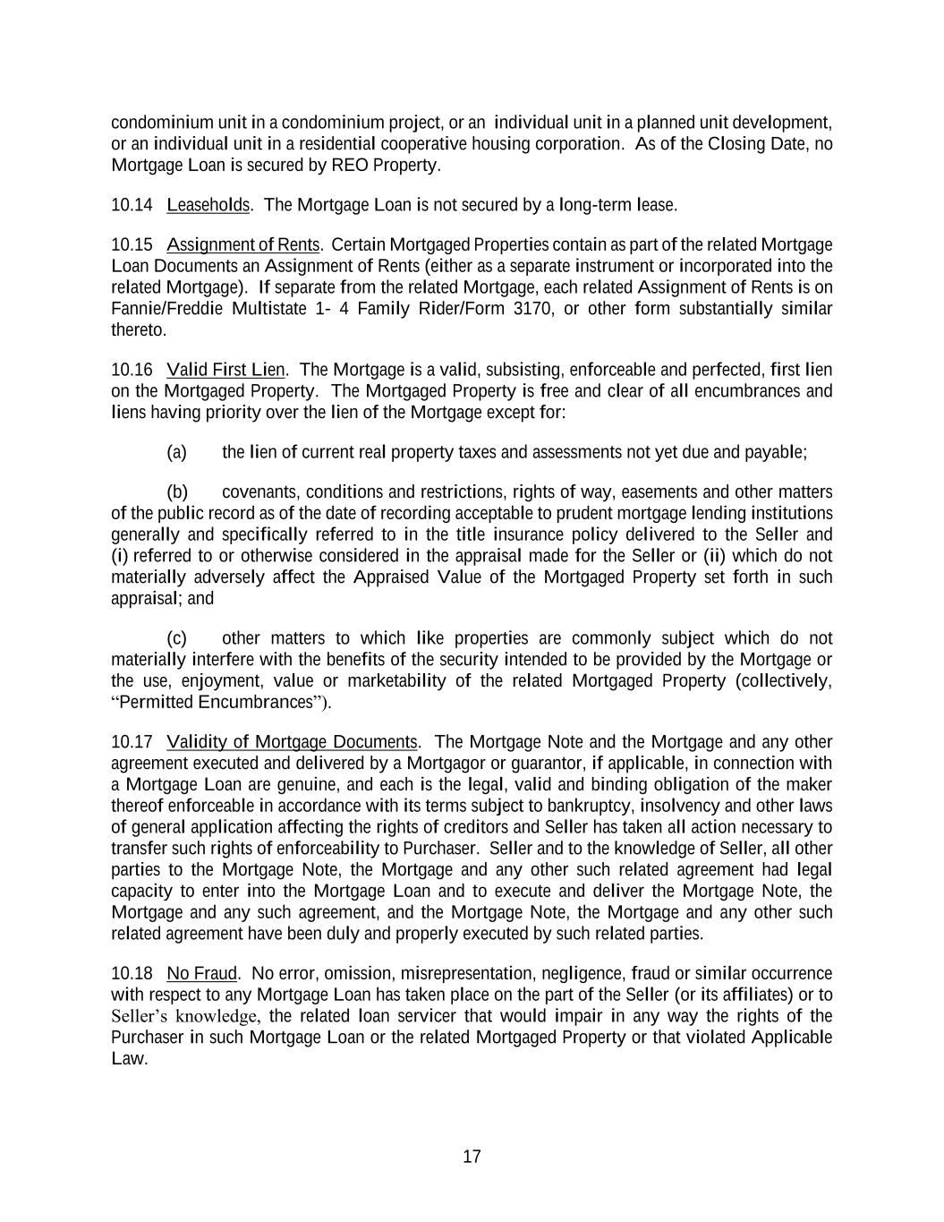 17 condominium unit in a condominium project, or an individual unit in a planned unit development, or an individual unit in a residential cooperative housing corporation. As of the Closing Date, no Mortgage Loan is secured by REO Property. 10.14 Leaseholds. The Mortgage Loan is not secured by a long-term lease. 10.15 Assignment of Rents. Certain Mortgaged Properties contain as part of the related Mortgage Loan Documents an Assignment of Rents (either as a separate instrument or incorporated into the related Mortgage). If separate from the related Mortgage, each related Assignment of Rents is on Fannie/Freddie Multistate 1- 4 Family Rider/Form 3170, or other form substantially similar thereto. 10.16 Valid First Lien. The Mortgage is a valid, subsisting, enforceable and perfected, first lien on the Mortgaged Property. The Mortgaged Property is free and clear of all encumbrances and liens having priority over the lien of the Mortgage except for: (a) the lien of current real property taxes and assessments not yet due and payable; (b) covenants, conditions and restrictions, rights of way, easements and other matters of the public record as of the date of recording acceptable to prudent mortgage lending institutions generally and specifically referred to in the title insurance policy delivered to the Seller and (i) referred to or otherwise considered in the appraisal made for the Seller or (ii) which do not materially adversely affect the Appraised Value of the Mortgaged Property set forth in such appraisal; and (c) other matters to which like properties are commonly subject which do not materially interfere with the benefits of the security intended to be provided by the Mortgage or the use, enjoyment, value or marketability of the related Mortgaged Property (collectively, “Permitted Encumbrances”). 10.17 Validity of Mortgage Documents. The Mortgage Note and the Mortgage and any other agreement executed and delivered by a Mortgagor or guarantor, if applicable, in connection with a Mortgage Loan are genuine, and each is the legal, valid and binding obligation of the maker thereof enforceable in accordance with its terms subject to bankruptcy, insolvency and other laws of general application affecting the rights of creditors and Seller has taken all action necessary to transfer such rights of enforceability to Purchaser. Seller and to the knowledge of Seller, all other parties to the Mortgage Note, the Mortgage and any other such related agreement had legal capacity to enter into the Mortgage Loan and to execute and deliver the Mortgage Note, the Mortgage and any such agreement, and the Mortgage Note, the Mortgage and any other such related agreement have been duly and properly executed by such related parties. 10.18 No Fraud. No error, omission, misrepresentation, negligence, fraud or similar occurrence with respect to any Mortgage Loan has taken place on the part of the Seller (or its affiliates) or to Seller’s knowledge, the related loan servicer that would impair in any way the rights of the Purchaser in such Mortgage Loan or the related Mortgaged Property or that violated Applicable Law.