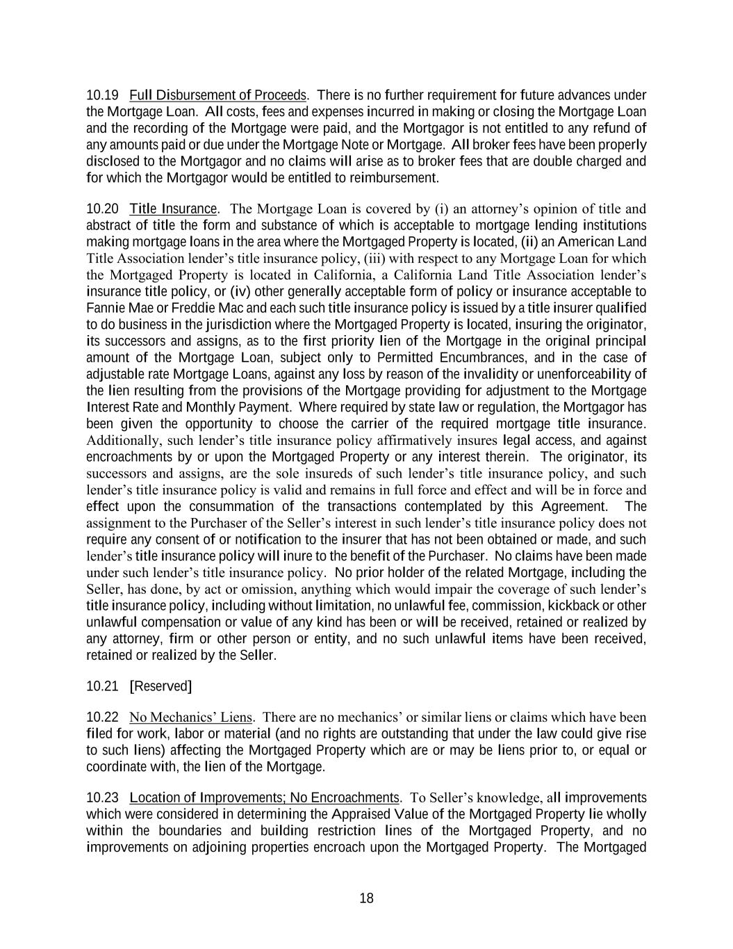 18 10.19 Full Disbursement of Proceeds. There is no further requirement for future advances under the Mortgage Loan. All costs, fees and expenses incurred in making or closing the Mortgage Loan and the recording of the Mortgage were paid, and the Mortgagor is not entitled to any refund of any amounts paid or due under the Mortgage Note or Mortgage. All broker fees have been properly disclosed to the Mortgagor and no claims will arise as to broker fees that are double charged and for which the Mortgagor would be entitled to reimbursement. 10.20 Title Insurance. The Mortgage Loan is covered by (i) an attorney’s opinion of title and abstract of title the form and substance of which is acceptable to mortgage lending institutions making mortgage loans in the area where the Mortgaged Property is located, (ii) an American Land Title Association lender’s title insurance policy, (iii) with respect to any Mortgage Loan for which the Mortgaged Property is located in California, a California Land Title Association lender’s insurance title policy, or (iv) other generally acceptable form of policy or insurance acceptable to Fannie Mae or Freddie Mac and each such title insurance policy is issued by a title insurer qualified to do business in the jurisdiction where the Mortgaged Property is located, insuring the originator, its successors and assigns, as to the first priority lien of the Mortgage in the original principal amount of the Mortgage Loan, subject only to Permitted Encumbrances, and in the case of adjustable rate Mortgage Loans, against any loss by reason of the invalidity or unenforceability of the lien resulting from the provisions of the Mortgage providing for adjustment to the Mortgage Interest Rate and Monthly Payment. Where required by state law or regulation, the Mortgagor has been given the opportunity to choose the carrier of the required mortgage title insurance. Additionally, such lender’s title insurance policy affirmatively insures legal access, and against encroachments by or upon the Mortgaged Property or any interest therein. The originator, its successors and assigns, are the sole insureds of such lender’s title insurance policy, and such lender’s title insurance policy is valid and remains in full force and effect and will be in force and effect upon the consummation of the transactions contemplated by this Agreement. The assignment to the Purchaser of the Seller’s interest in such lender’s title insurance policy does not require any consent of or notification to the insurer that has not been obtained or made, and such lender’s title insurance policy will inure to the benefit of the Purchaser. No claims have been made under such lender’s title insurance policy. No prior holder of the related Mortgage, including the Seller, has done, by act or omission, anything which would impair the coverage of such lender’s title insurance policy, including without limitation, no unlawful fee, commission, kickback or other unlawful compensation or value of any kind has been or will be received, retained or realized by any attorney, firm or other person or entity, and no such unlawful items have been received, retained or realized by the Seller. 10.21 [Reserved] 10.22 No Mechanics’ Liens. There are no mechanics’ or similar liens or claims which have been filed for work, labor or material (and no rights are outstanding that under the law could give rise to such liens) affecting the Mortgaged Property which are or may be liens prior to, or equal or coordinate with, the lien of the Mortgage. 10.23 Location of Improvements; No Encroachments. To Seller’s knowledge, all improvements which were considered in determining the Appraised Value of the Mortgaged Property lie wholly within the boundaries and building restriction lines of the Mortgaged Property, and no improvements on adjoining properties encroach upon the Mortgaged Property. The Mortgaged