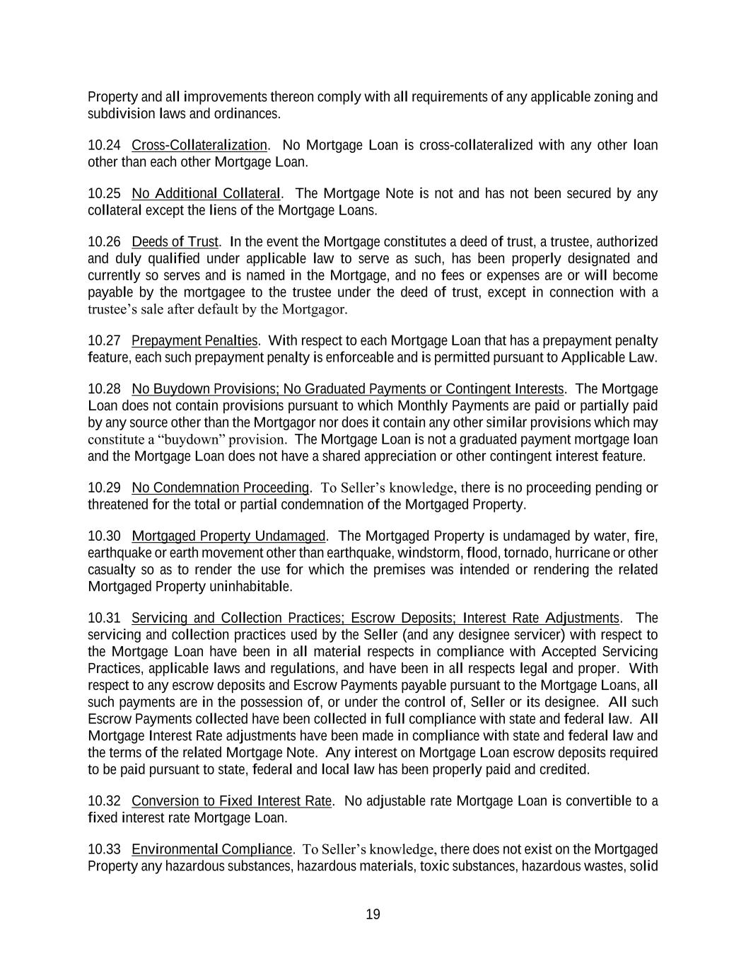 19 Property and all improvements thereon comply with all requirements of any applicable zoning and subdivision laws and ordinances. 10.24 Cross-Collateralization. No Mortgage Loan is cross-collateralized with any other loan other than each other Mortgage Loan. 10.25 No Additional Collateral. The Mortgage Note is not and has not been secured by any collateral except the liens of the Mortgage Loans. 10.26 Deeds of Trust. In the event the Mortgage constitutes a deed of trust, a trustee, authorized and duly qualified under applicable law to serve as such, has been properly designated and currently so serves and is named in the Mortgage, and no fees or expenses are or will become payable by the mortgagee to the trustee under the deed of trust, except in connection with a trustee’s sale after default by the Mortgagor. 10.27 Prepayment Penalties. With respect to each Mortgage Loan that has a prepayment penalty feature, each such prepayment penalty is enforceable and is permitted pursuant to Applicable Law. 10.28 No Buydown Provisions; No Graduated Payments or Contingent Interests. The Mortgage Loan does not contain provisions pursuant to which Monthly Payments are paid or partially paid by any source other than the Mortgagor nor does it contain any other similar provisions which may constitute a “buydown” provision. The Mortgage Loan is not a graduated payment mortgage loan and the Mortgage Loan does not have a shared appreciation or other contingent interest feature. 10.29 No Condemnation Proceeding. To Seller’s knowledge, there is no proceeding pending or threatened for the total or partial condemnation of the Mortgaged Property. 10.30 Mortgaged Property Undamaged. The Mortgaged Property is undamaged by water, fire, earthquake or earth movement other than earthquake, windstorm, flood, tornado, hurricane or other casualty so as to render the use for which the premises was intended or rendering the related Mortgaged Property uninhabitable. 10.31 Servicing and Collection Practices; Escrow Deposits; Interest Rate Adjustments. The servicing and collection practices used by the Seller (and any designee servicer) with respect to the Mortgage Loan have been in all material respects in compliance with Accepted Servicing Practices, applicable laws and regulations, and have been in all respects legal and proper. With respect to any escrow deposits and Escrow Payments payable pursuant to the Mortgage Loans, all such payments are in the possession of, or under the control of, Seller or its designee. All such Escrow Payments collected have been collected in full compliance with state and federal law. All Mortgage Interest Rate adjustments have been made in compliance with state and federal law and the terms of the related Mortgage Note. Any interest on Mortgage Loan escrow deposits required to be paid pursuant to state, federal and local law has been properly paid and credited. 10.32 Conversion to Fixed Interest Rate. No adjustable rate Mortgage Loan is convertible to a fixed interest rate Mortgage Loan. 10.33 Environmental Compliance. To Seller’s knowledge, there does not exist on the Mortgaged Property any hazardous substances, hazardous materials, toxic substances, hazardous wastes, solid