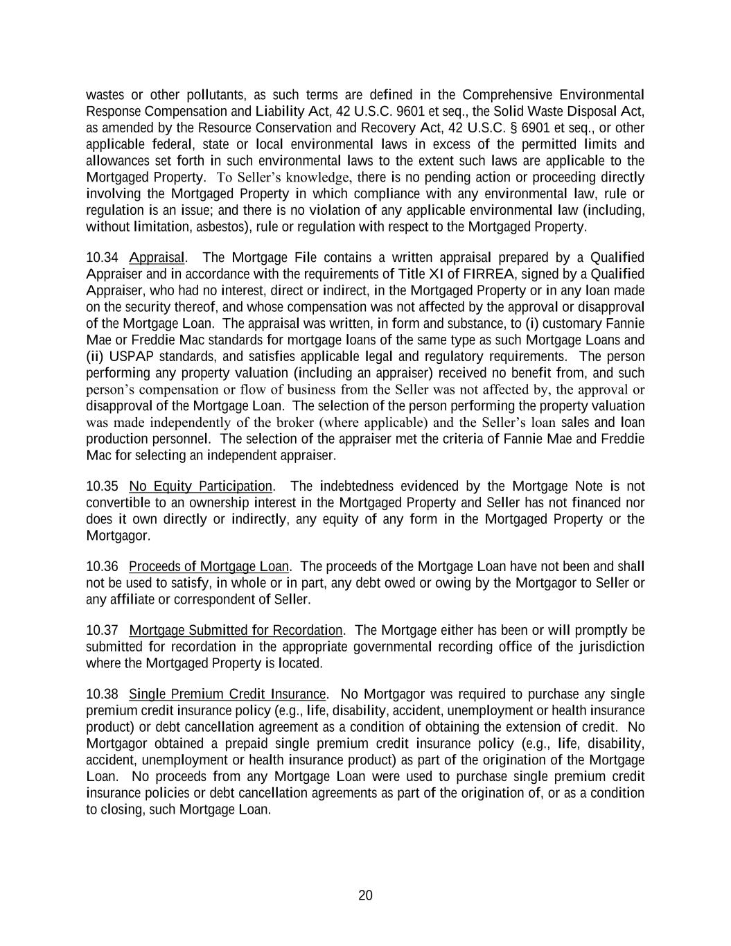 20 wastes or other pollutants, as such terms are defined in the Comprehensive Environmental Response Compensation and Liability Act, 42 U.S.C. 9601 et seq., the Solid Waste Disposal Act, as amended by the Resource Conservation and Recovery Act, 42 U.S.C. § 6901 et seq., or other applicable federal, state or local environmental laws in excess of the permitted limits and allowances set forth in such environmental laws to the extent such laws are applicable to the Mortgaged Property. To Seller’s knowledge, there is no pending action or proceeding directly involving the Mortgaged Property in which compliance with any environmental law, rule or regulation is an issue; and there is no violation of any applicable environmental law (including, without limitation, asbestos), rule or regulation with respect to the Mortgaged Property. 10.34 Appraisal. The Mortgage File contains a written appraisal prepared by a Qualified Appraiser and in accordance with the requirements of Title XI of FIRREA, signed by a Qualified Appraiser, who had no interest, direct or indirect, in the Mortgaged Property or in any loan made on the security thereof, and whose compensation was not affected by the approval or disapproval of the Mortgage Loan. The appraisal was written, in form and substance, to (i) customary Fannie Mae or Freddie Mac standards for mortgage loans of the same type as such Mortgage Loans and (ii) USPAP standards, and satisfies applicable legal and regulatory requirements. The person performing any property valuation (including an appraiser) received no benefit from, and such person’s compensation or flow of business from the Seller was not affected by, the approval or disapproval of the Mortgage Loan. The selection of the person performing the property valuation was made independently of the broker (where applicable) and the Seller’s loan sales and loan production personnel. The selection of the appraiser met the criteria of Fannie Mae and Freddie Mac for selecting an independent appraiser. 10.35 No Equity Participation. The indebtedness evidenced by the Mortgage Note is not convertible to an ownership interest in the Mortgaged Property and Seller has not financed nor does it own directly or indirectly, any equity of any form in the Mortgaged Property or the Mortgagor. 10.36 Proceeds of Mortgage Loan. The proceeds of the Mortgage Loan have not been and shall not be used to satisfy, in whole or in part, any debt owed or owing by the Mortgagor to Seller or any affiliate or correspondent of Seller. 10.37 Mortgage Submitted for Recordation. The Mortgage either has been or will promptly be submitted for recordation in the appropriate governmental recording office of the jurisdiction where the Mortgaged Property is located. 10.38 Single Premium Credit Insurance. No Mortgagor was required to purchase any single premium credit insurance policy (e.g., life, disability, accident, unemployment or health insurance product) or debt cancellation agreement as a condition of obtaining the extension of credit. No Mortgagor obtained a prepaid single premium credit insurance policy (e.g., life, disability, accident, unemployment or health insurance product) as part of the origination of the Mortgage Loan. No proceeds from any Mortgage Loan were used to purchase single premium credit insurance policies or debt cancellation agreements as part of the origination of, or as a condition to closing, such Mortgage Loan.