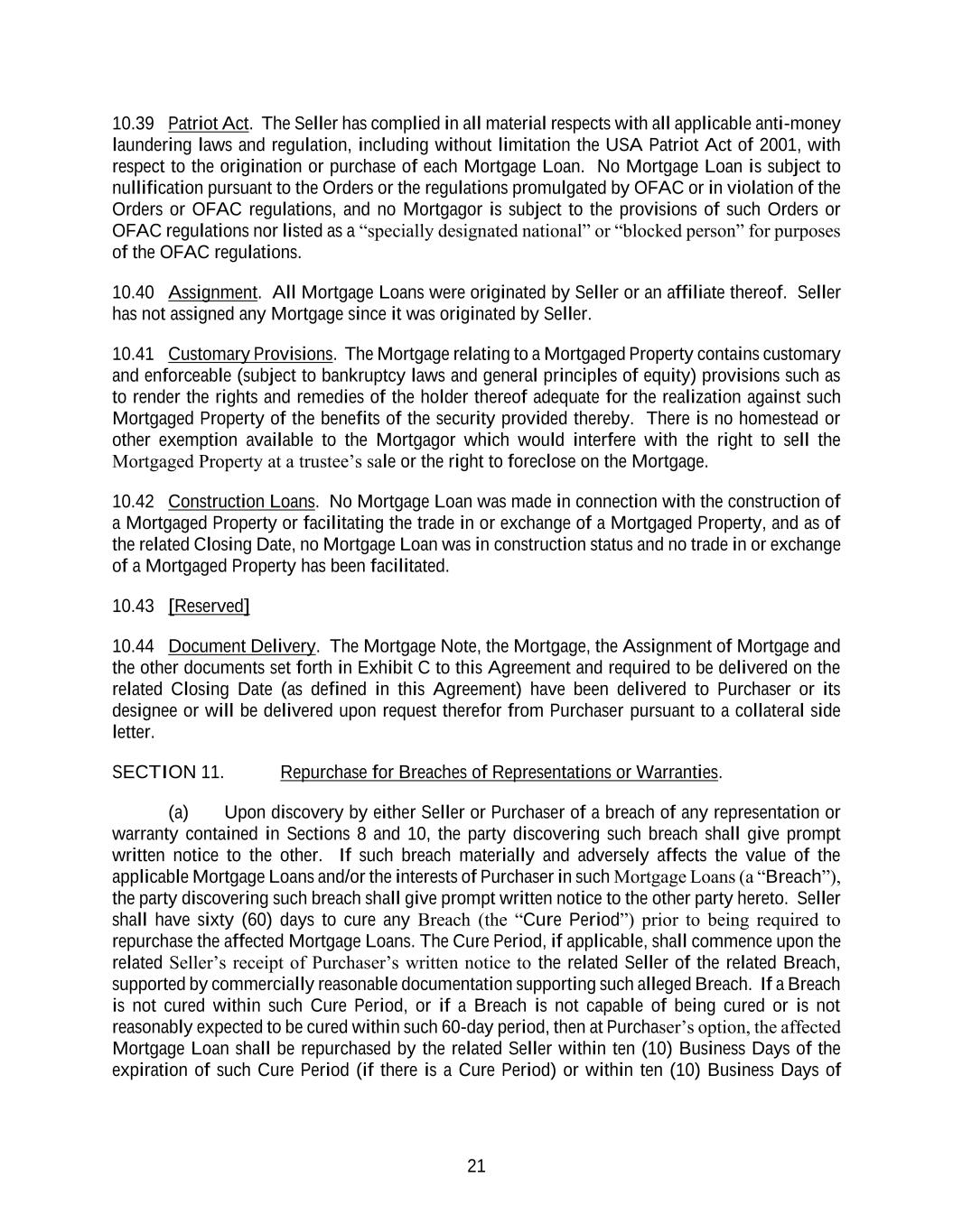 21 10.39 Patriot Act. The Seller has complied in all material respects with all applicable anti-money laundering laws and regulation, including without limitation the USA Patriot Act of 2001, with respect to the origination or purchase of each Mortgage Loan. No Mortgage Loan is subject to nullification pursuant to the Orders or the regulations promulgated by OFAC or in violation of the Orders or OFAC regulations, and no Mortgagor is subject to the provisions of such Orders or OFAC regulations nor listed as a “specially designated national” or “blocked person” for purposes of the OFAC regulations. 10.40 Assignment. All Mortgage Loans were originated by Seller or an affiliate thereof. Seller has not assigned any Mortgage since it was originated by Seller. 10.41 Customary Provisions. The Mortgage relating to a Mortgaged Property contains customary and enforceable (subject to bankruptcy laws and general principles of equity) provisions such as to render the rights and remedies of the holder thereof adequate for the realization against such Mortgaged Property of the benefits of the security provided thereby. There is no homestead or other exemption available to the Mortgagor which would interfere with the right to sell the Mortgaged Property at a trustee’s sale or the right to foreclose on the Mortgage. 10.42 Construction Loans. No Mortgage Loan was made in connection with the construction of a Mortgaged Property or facilitating the trade in or exchange of a Mortgaged Property, and as of the related Closing Date, no Mortgage Loan was in construction status and no trade in or exchange of a Mortgaged Property has been facilitated. 10.43 [Reserved] 10.44 Document Delivery. The Mortgage Note, the Mortgage, the Assignment of Mortgage and the other documents set forth in Exhibit C to this Agreement and required to be delivered on the related Closing Date (as defined in this Agreement) have been delivered to Purchaser or its designee or will be delivered upon request therefor from Purchaser pursuant to a collateral side letter. SECTION 11. Repurchase for Breaches of Representations or Warranties. (a) Upon discovery by either Seller or Purchaser of a breach of any representation or warranty contained in Sections 8 and 10, the party discovering such breach shall give prompt written notice to the other. If such breach materially and adversely affects the value of the applicable Mortgage Loans and/or the interests of Purchaser in such Mortgage Loans (a “Breach”), the party discovering such breach shall give prompt written notice to the other party hereto. Seller shall have sixty (60) days to cure any Breach (the “Cure Period”) prior to being required to repurchase the affected Mortgage Loans. The Cure Period, if applicable, shall commence upon the related Seller’s receipt of Purchaser’s written notice to the related Seller of the related Breach, supported by commercially reasonable documentation supporting such alleged Breach. If a Breach is not cured within such Cure Period, or if a Breach is not capable of being cured or is not reasonably expected to be cured within such 60-day period, then at Purchaser’s option, the affected Mortgage Loan shall be repurchased by the related Seller within ten (10) Business Days of the expiration of such Cure Period (if there is a Cure Period) or within ten (10) Business Days of