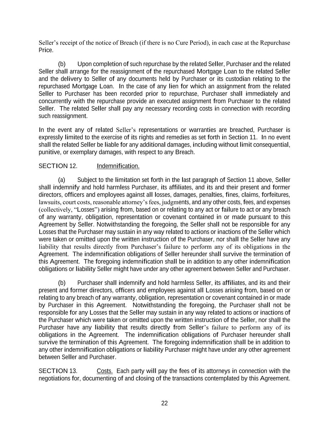 22 Seller’s receipt of the notice of Breach (if there is no Cure Period), in each case at the Repurchase Price. (b) Upon completion of such repurchase by the related Seller, Purchaser and the related Seller shall arrange for the reassignment of the repurchased Mortgage Loan to the related Seller and the delivery to Seller of any documents held by Purchaser or its custodian relating to the repurchased Mortgage Loan. In the case of any lien for which an assignment from the related Seller to Purchaser has been recorded prior to repurchase, Purchaser shall immediately and concurrently with the repurchase provide an executed assignment from Purchaser to the related Seller. The related Seller shall pay any necessary recording costs in connection with recording such reassignment. In the event any of related Seller’s representations or warranties are breached, Purchaser is expressly limited to the exercise of its rights and remedies as set forth in Section 11. In no event shall the related Seller be liable for any additional damages, including without limit consequential, punitive, or exemplary damages, with respect to any Breach. SECTION 12. Indemnification. (a) Subject to the limitation set forth in the last paragraph of Section 11 above, Seller shall indemnify and hold harmless Purchaser, its affiliates, and its and their present and former directors, officers and employees against all losses, damages, penalties, fines, claims, forfeitures, lawsuits, court costs, reasonable attorney’s fees, judgments, and any other costs, fees, and expenses (collectively, “Losses”) arising from, based on or relating to any act or failure to act or any breach of any warranty, obligation, representation or covenant contained in or made pursuant to this Agreement by Seller. Notwithstanding the foregoing, the Seller shall not be responsible for any Losses that the Purchaser may sustain in any way related to actions or inactions of the Seller which were taken or omitted upon the written instruction of the Purchaser, nor shall the Seller have any liability that results directly from Purchaser’s failure to perform any of its obligations in the Agreement. The indemnification obligations of Seller hereunder shall survive the termination of this Agreement. The foregoing indemnification shall be in addition to any other indemnification obligations or liability Seller might have under any other agreement between Seller and Purchaser. (b) Purchaser shall indemnify and hold harmless Seller, its affiliates, and its and their present and former directors, officers and employees against all Losses arising from, based on or relating to any breach of any warranty, obligation, representation or covenant contained in or made by Purchaser in this Agreement. Notwithstanding the foregoing, the Purchaser shall not be responsible for any Losses that the Seller may sustain in any way related to actions or inactions of the Purchaser which were taken or omitted upon the written instruction of the Seller, nor shall the Purchaser have any liability that results directly from Seller’s failure to perform any of its obligations in the Agreement. The indemnification obligations of Purchaser hereunder shall survive the termination of this Agreement. The foregoing indemnification shall be in addition to any other indemnification obligations or liability Purchaser might have under any other agreement between Seller and Purchaser. SECTION 13. Costs. Each party will pay the fees of its attorneys in connection with the negotiations for, documenting of and closing of the transactions contemplated by this Agreement.