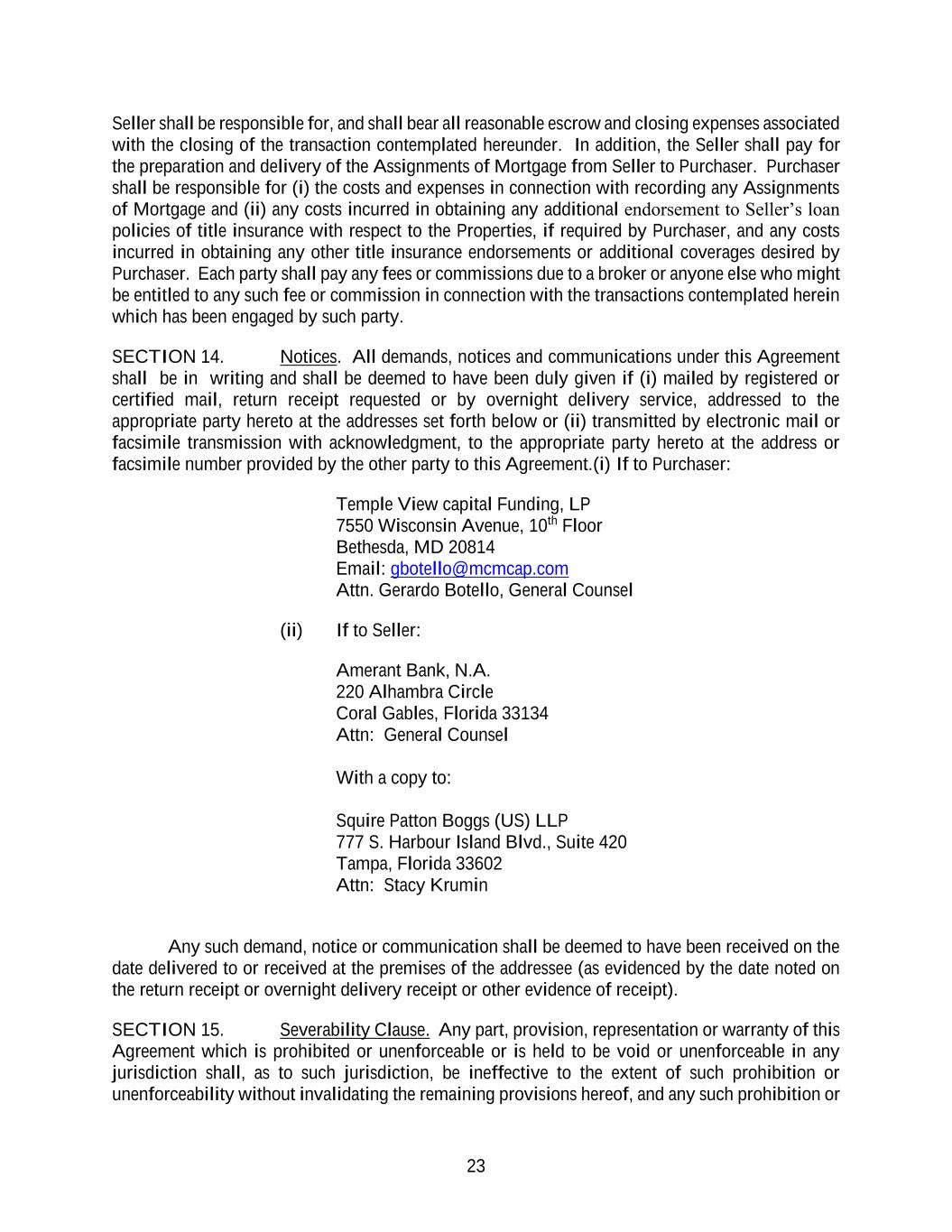 23 Seller shall be responsible for, and shall bear all reasonable escrow and closing expenses associated with the closing of the transaction contemplated hereunder. In addition, the Seller shall pay for the preparation and delivery of the Assignments of Mortgage from Seller to Purchaser. Purchaser shall be responsible for (i) the costs and expenses in connection with recording any Assignments of Mortgage and (ii) any costs incurred in obtaining any additional endorsement to Seller’s loan policies of title insurance with respect to the Properties, if required by Purchaser, and any costs incurred in obtaining any other title insurance endorsements or additional coverages desired by Purchaser. Each party shall pay any fees or commissions due to a broker or anyone else who might be entitled to any such fee or commission in connection with the transactions contemplated herein which has been engaged by such party. SECTION 14. Notices. All demands, notices and communications under this Agreement shall be in writing and shall be deemed to have been duly given if (i) mailed by registered or certified mail, return receipt requested or by overnight delivery service, addressed to the appropriate party hereto at the addresses set forth below or (ii) transmitted by electronic mail or facsimile transmission with acknowledgment, to the appropriate party hereto at the address or facsimile number provided by the other party to this Agreement.(i) If to Purchaser: Temple View capital Funding, LP 7550 Wisconsin Avenue, 10th Floor Bethesda, MD 20814 Email: gbotello@mcmcap.com Attn. Gerardo Botello, General Counsel (ii) If to Seller: Amerant Bank, N.A. 220 Alhambra Circle Coral Gables, Florida 33134 Attn: General Counsel With a copy to: Squire Patton Boggs (US) LLP 777 S. Harbour Island Blvd., Suite 420 Tampa, Florida 33602 Attn: Stacy Krumin Any such demand, notice or communication shall be deemed to have been received on the date delivered to or received at the premises of the addressee (as evidenced by the date noted on the return receipt or overnight delivery receipt or other evidence of receipt). SECTION 15. Severability Clause. Any part, provision, representation or warranty of this Agreement which is prohibited or unenforceable or is held to be void or unenforceable in any jurisdiction shall, as to such jurisdiction, be ineffective to the extent of such prohibition or unenforceability without invalidating the remaining provisions hereof, and any such prohibition or